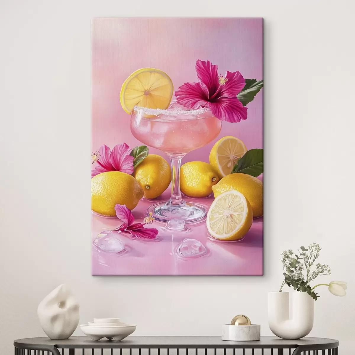 Wandbilder Sommercocktail mit Blumen und Zitronen, rosa Farben, Aquarellstil Art. s43895