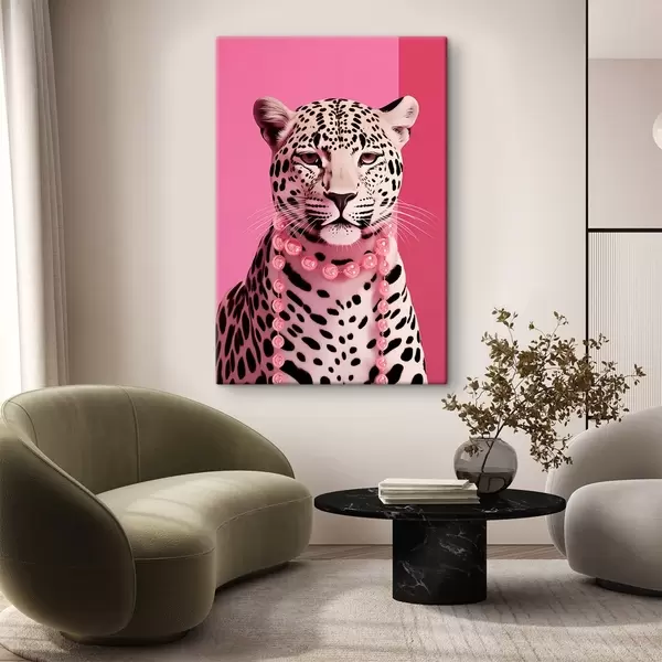 Wandbilder Porträt eines Leoparden mit rosa Halskette Art. s43976
