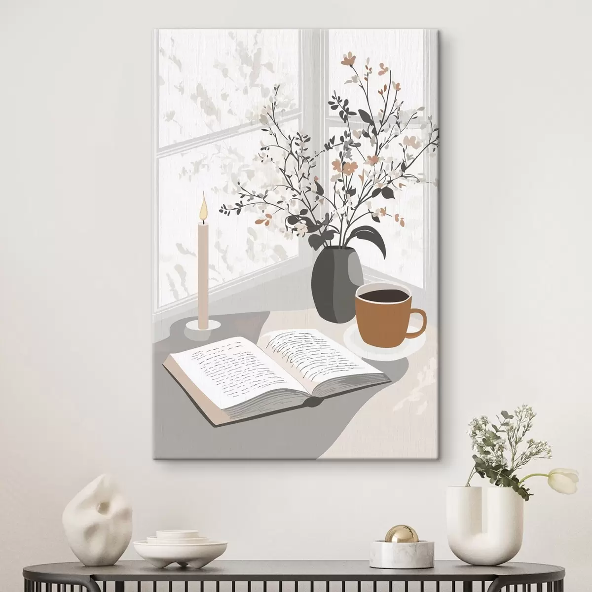 Wandbilder Abstraktion, offenes Buch, Vase mit Blumen, Kerze, beige Farben s44011