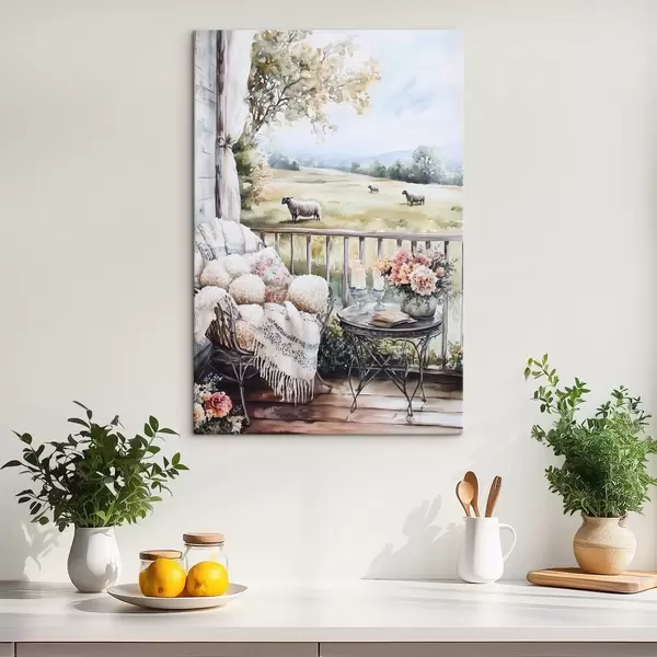 Wandbilder Bauernhof auf dem Land mit Schafen, Feldern, rustikalen Blumen, Aquarellstil Art. s44014