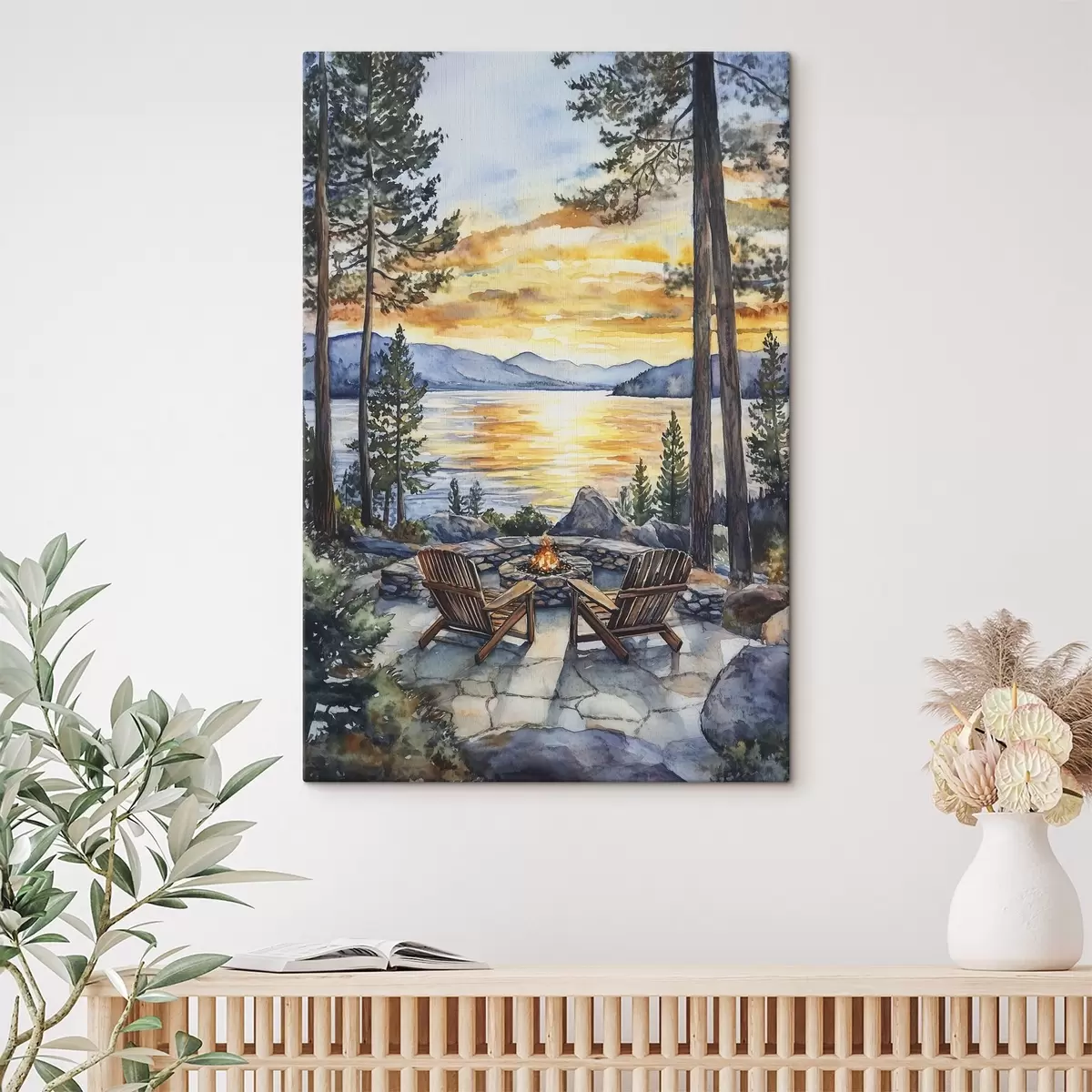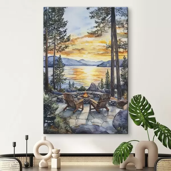 Wandbilder See mit Bergen auf den Sonnenuntergang, Reisen, gemütlichen Kamin, Aquarell Art. s44018