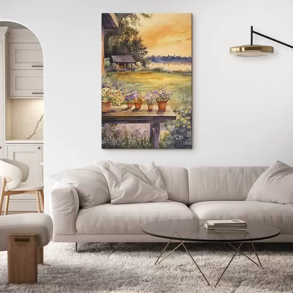 Wandbilder Blumen im Dorfgarten, Sonnenuntergang Farben, Aquarell-Stil s44019
