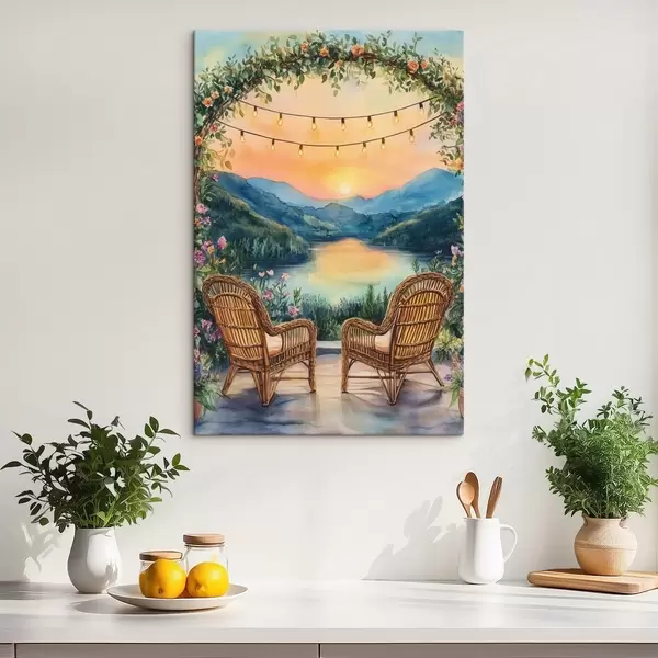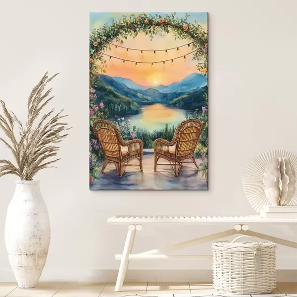 Wandbilder Korbstühle auf den Sonnenuntergang, Berge Landschaft, Boho-Stil s44020