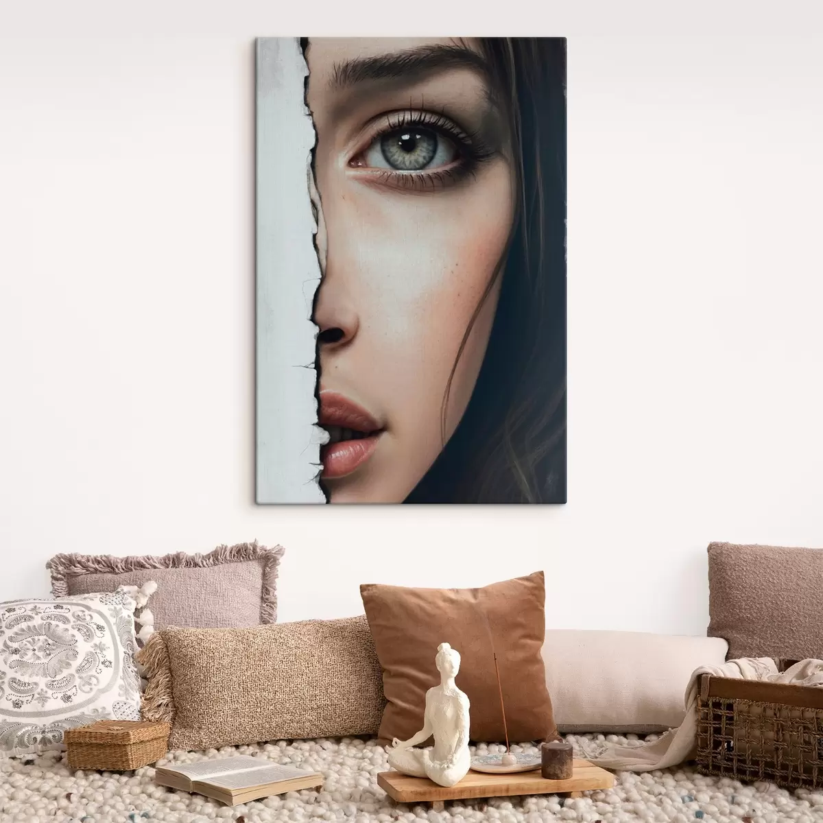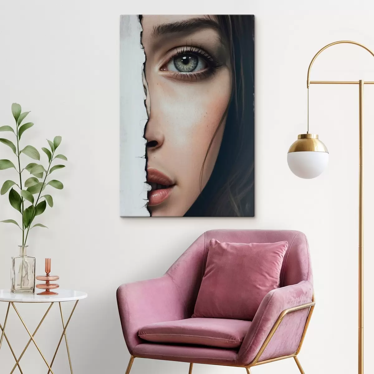 Wandbilder Gesicht eines Mädchens hinter einer weißen Wand Art. s44083