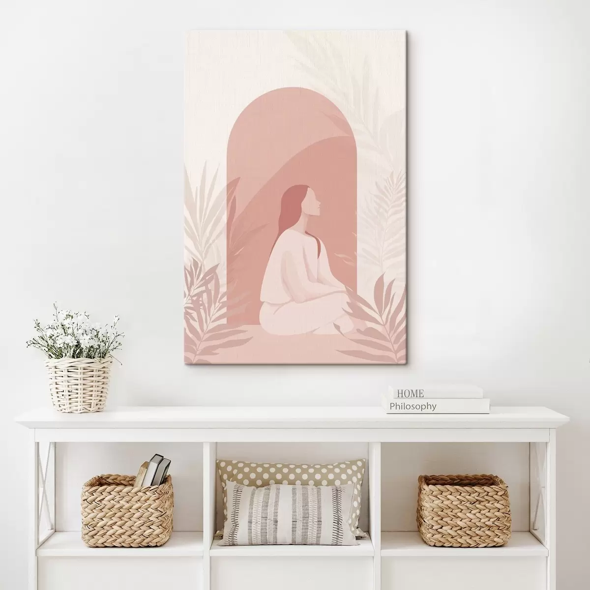Wandbilder Frau in Meditation, flacher Stil, tropische Pflanzen, rosa Farben s44154