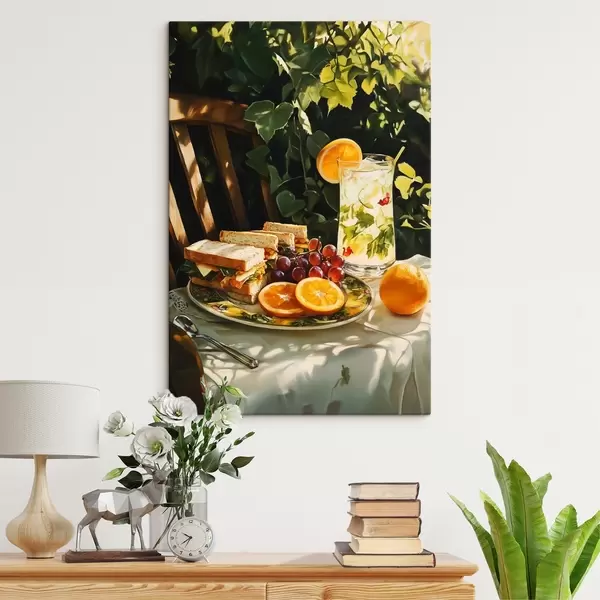 Wandbilder Ästhetisches Picknick im Sommergarten, belegte Brote, Orangen, Limonade Art. s44306