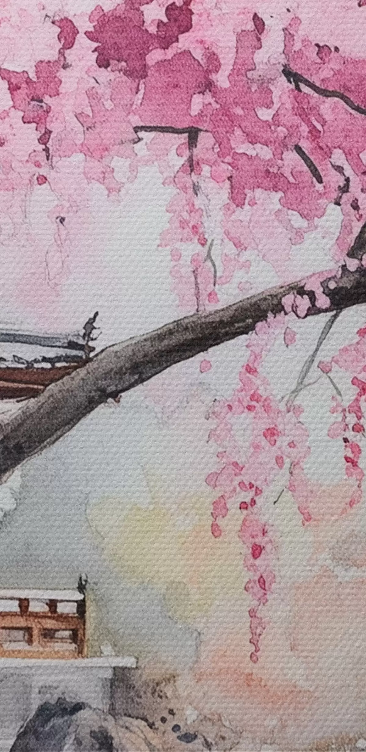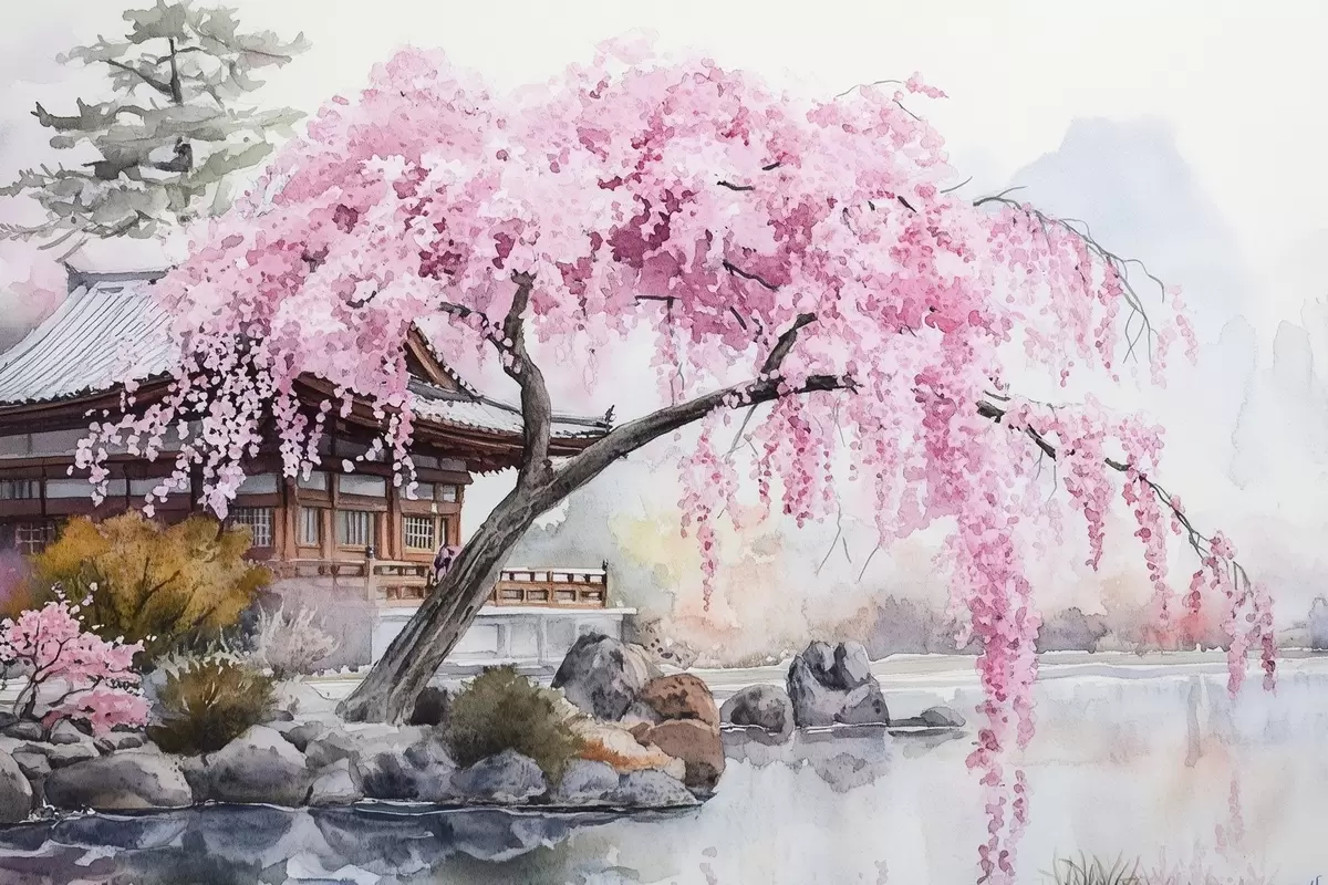 Wandbilder Rosa Kirschbaum in der Nähe von Haus auf dem See, Japan, orientalisch, Aquarell-Stil s44312