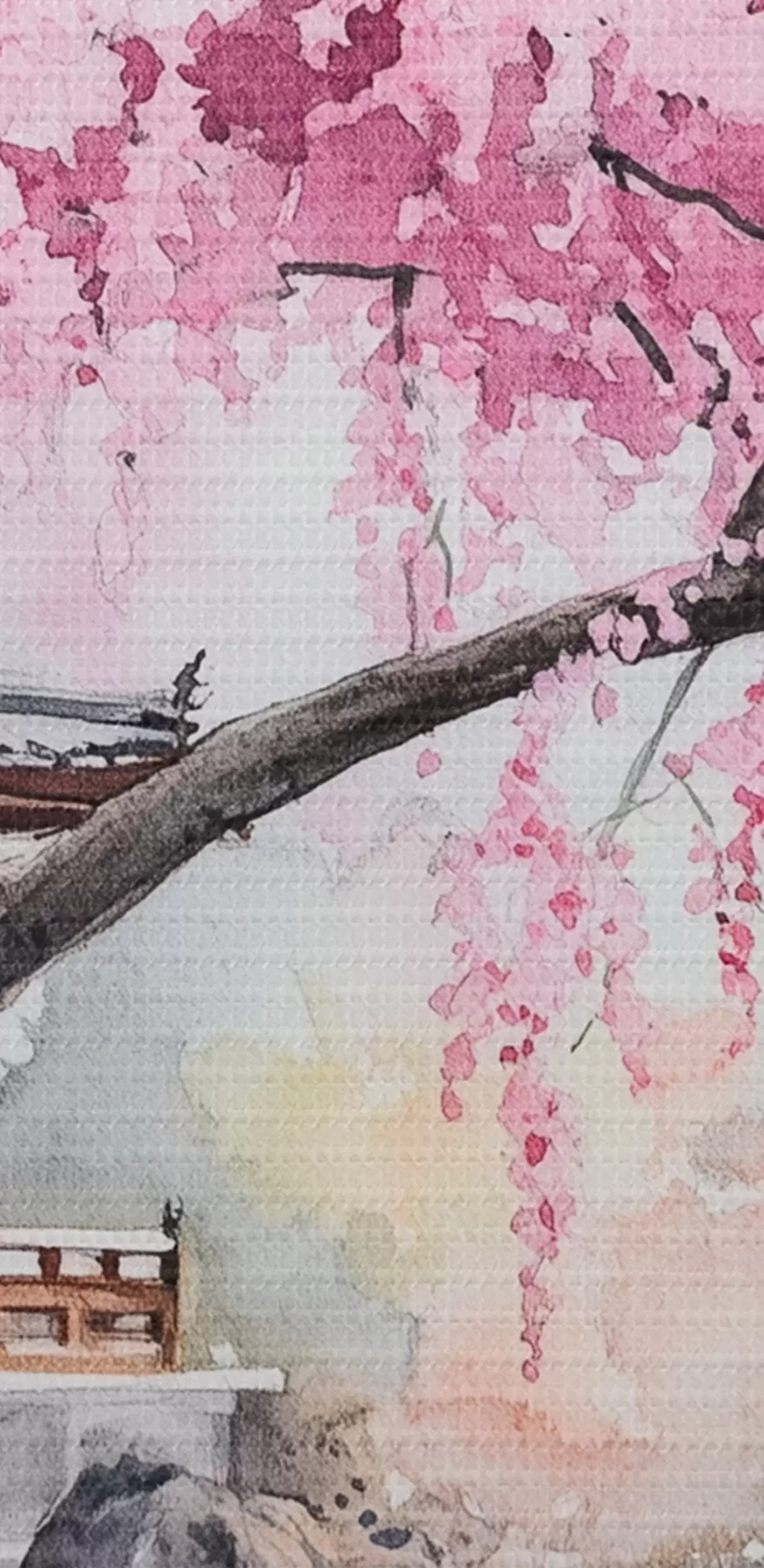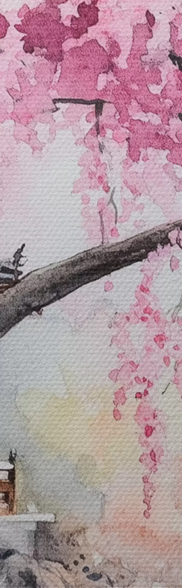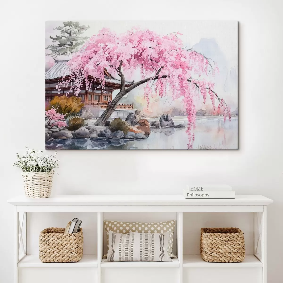 Wandbilder Rosa Kirschbaum in der Nähe von Haus auf dem See, Japan, orientalisch, Aquarell-Stil Art. s44312