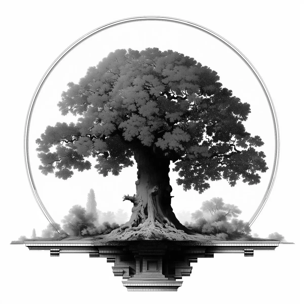Wandbilder Monochromer Baum mit mächtigem Stamm und weit ausladender Krone s44346