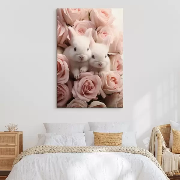 Wandbilder Zwei weiße Kaninchen in zarten Rosenblüten Art. s44380
