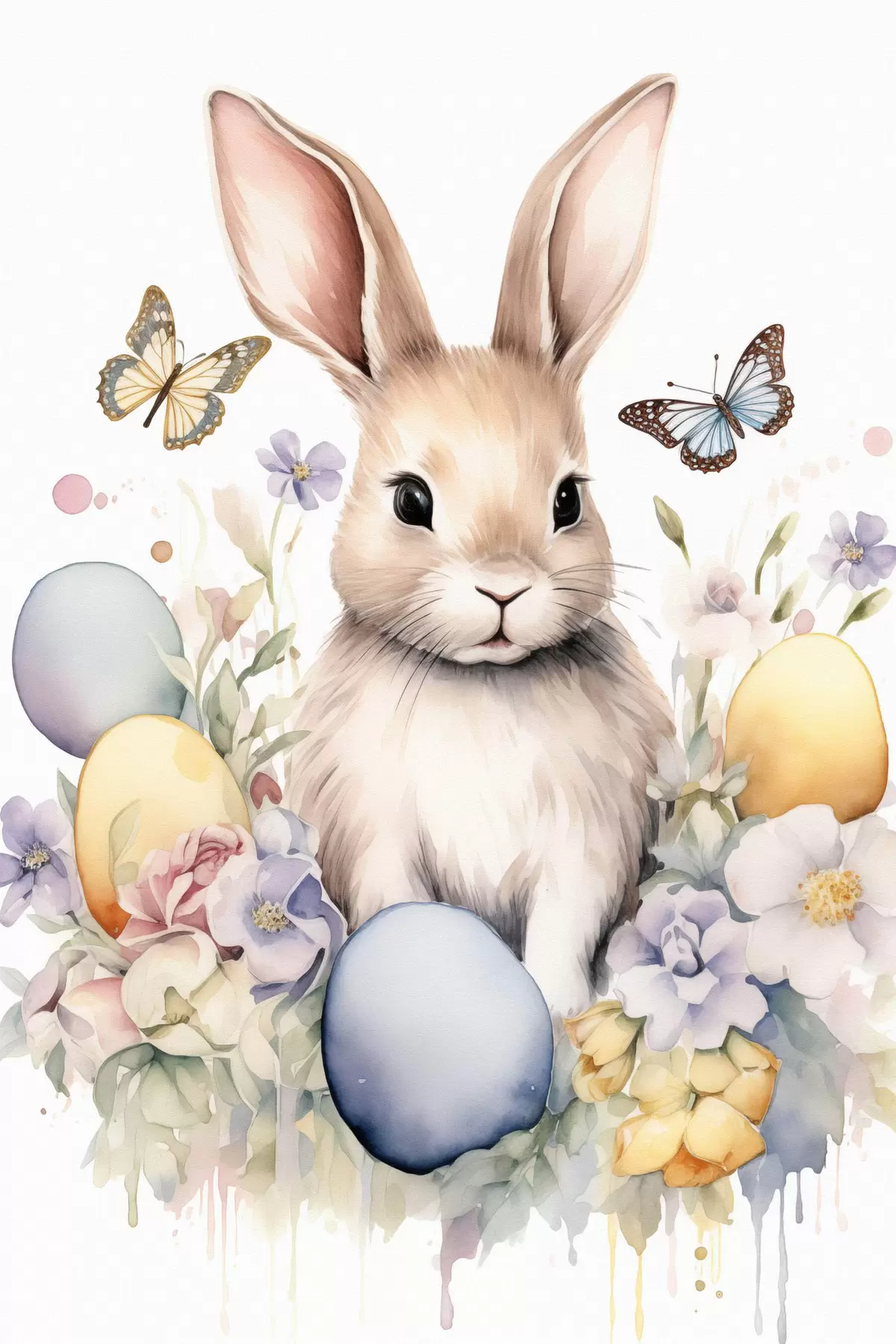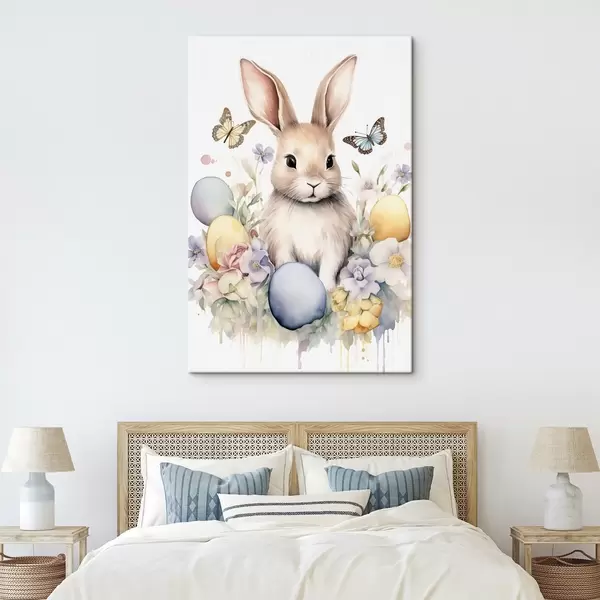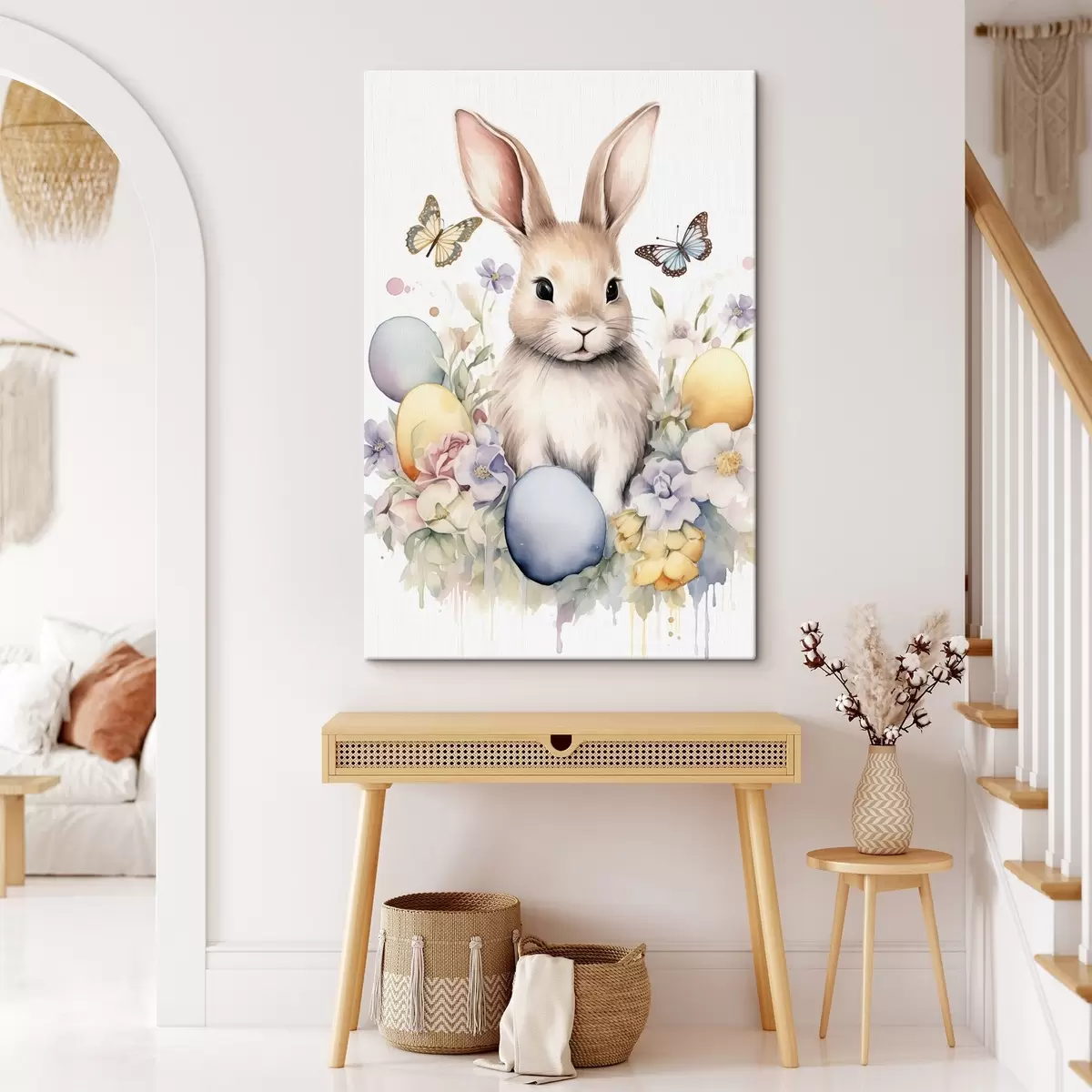 Wandbilder Niedliches Häschen im Aquarellstil in Blumen mit Schmetterlingen Art. s44388