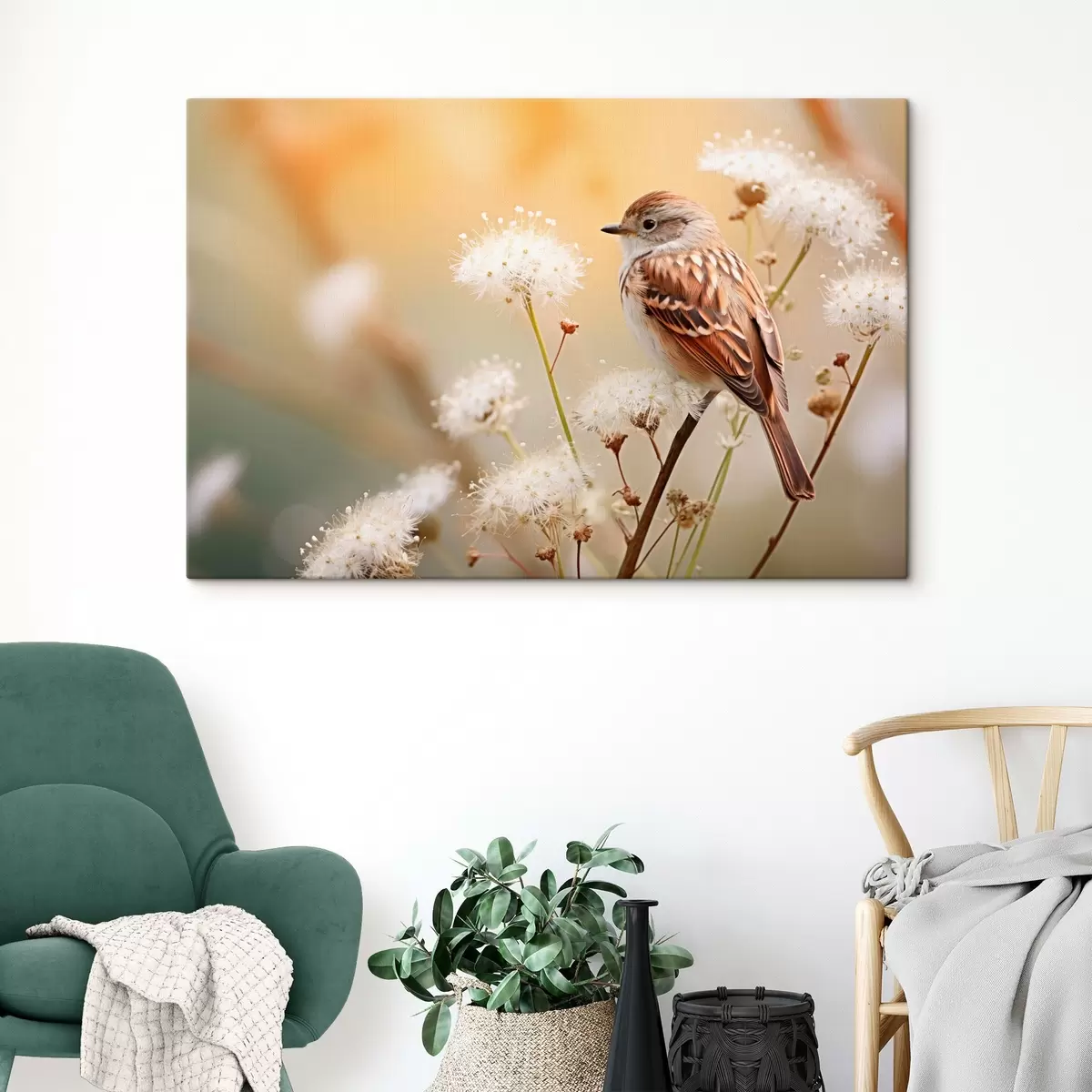Wandbilder Ein Vogel sitzt auf einem Zweig mit weißen Blumen, Weichzeichner, Natur Hintergrund Art. s44393