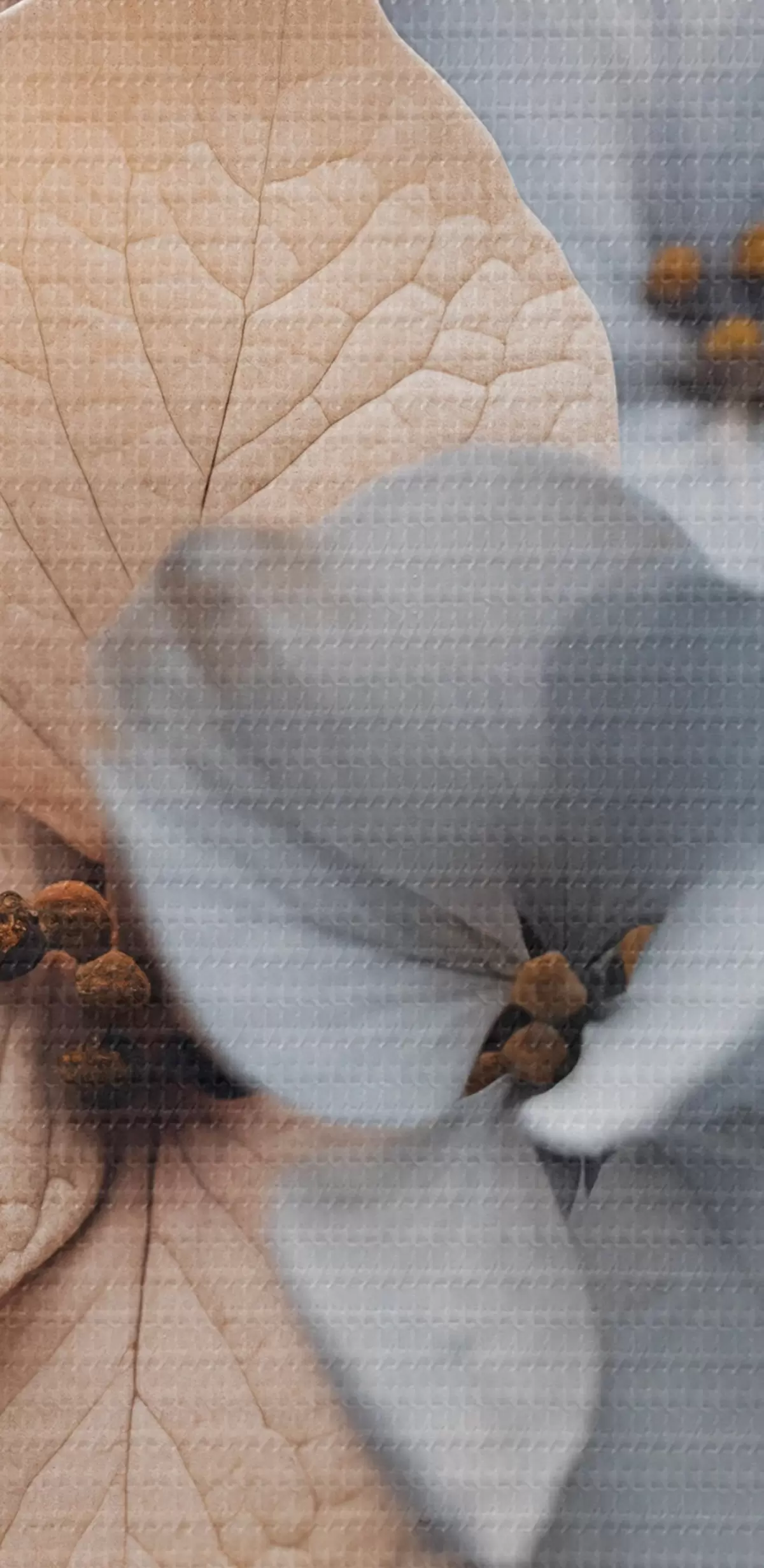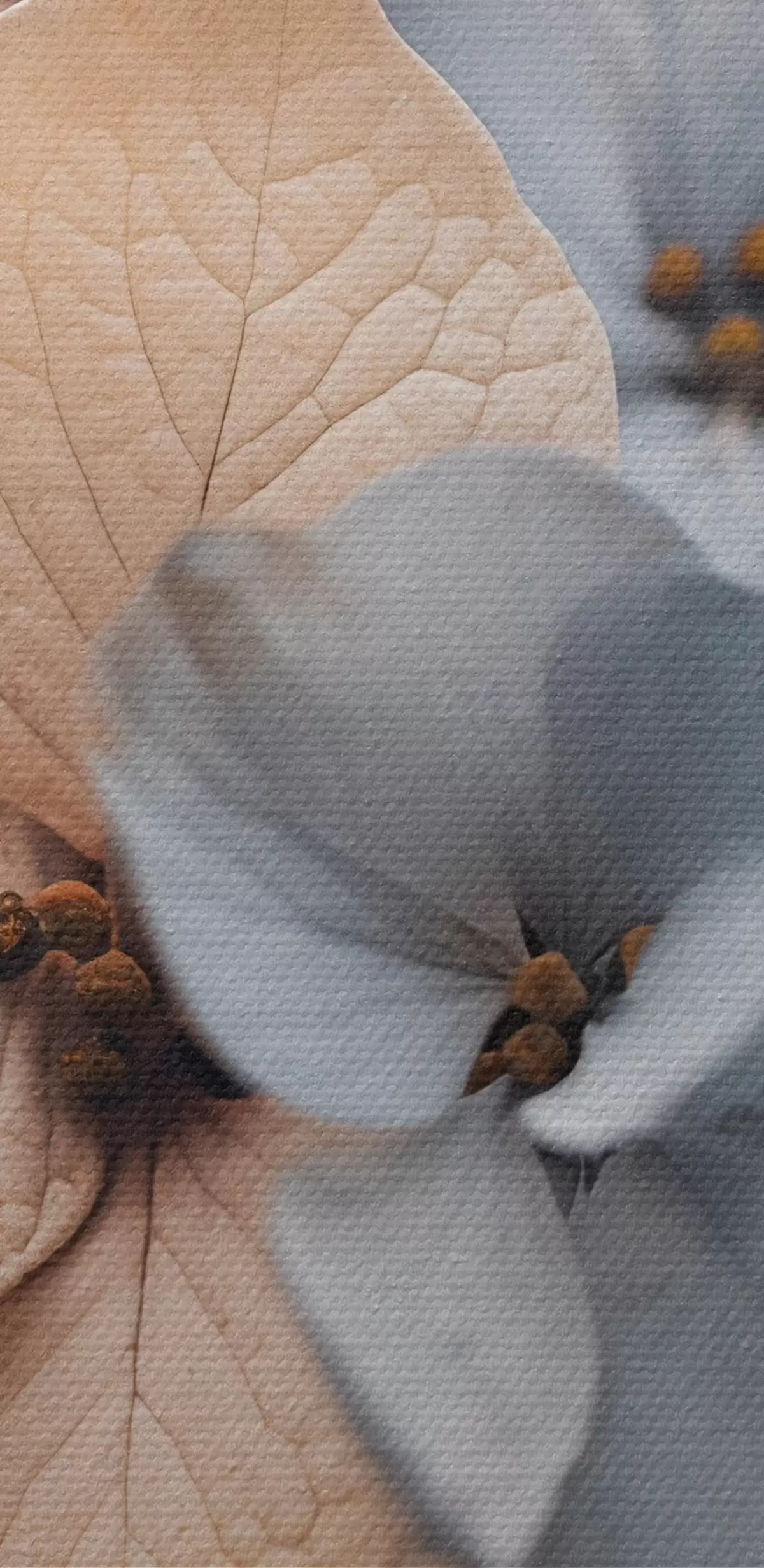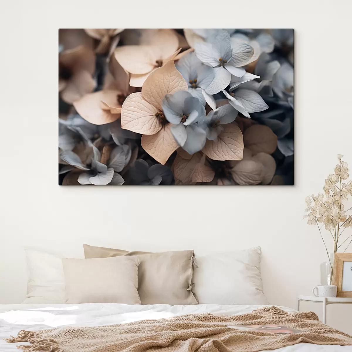 Wandbilder Hortensienblüten, hellblaue und beige Blütenblätter, mit detaillierten Texturen, elegantes Blumenarrangement Art. s44394