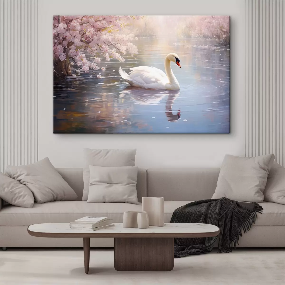 Wandbilder Ein weißer Schwan schwimmt in einem See mit Kirschblütenbäumen, Pastellfarben Art. s44396