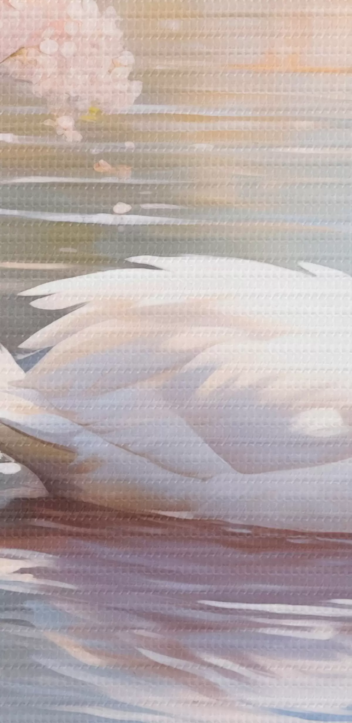 Wandbilder Ein weißer Schwan schwimmt in einem See mit Kirschblütenbäumen, Pastellfarben s44396
