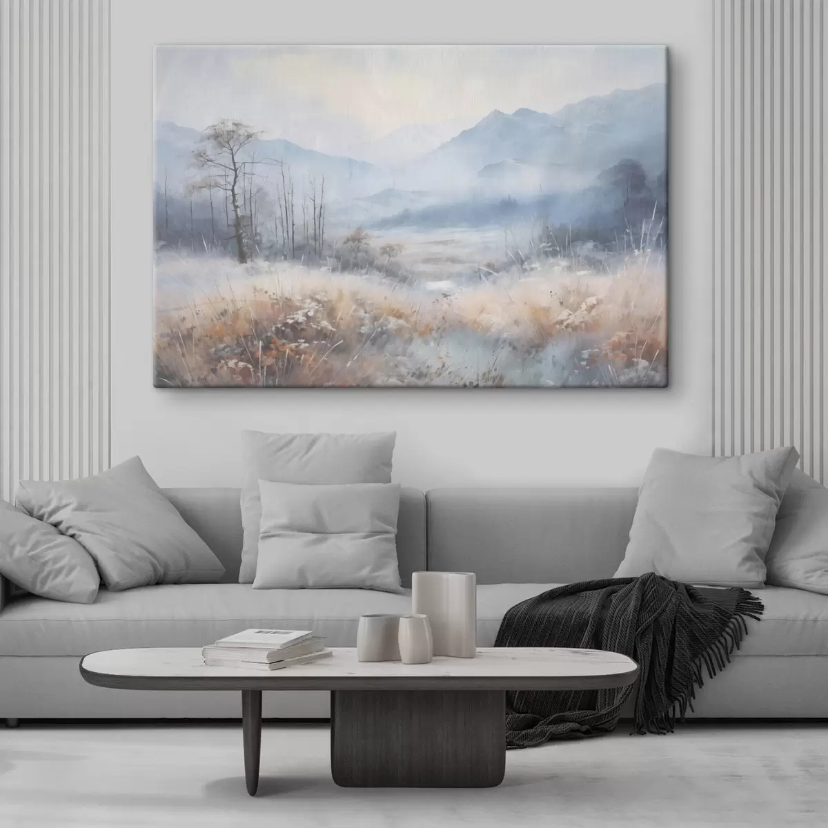 Wandbilder Strukturierte Landschaft mit Bergen, trockenem Gras und einem Wald, gedämpfte Farben Art. s44402