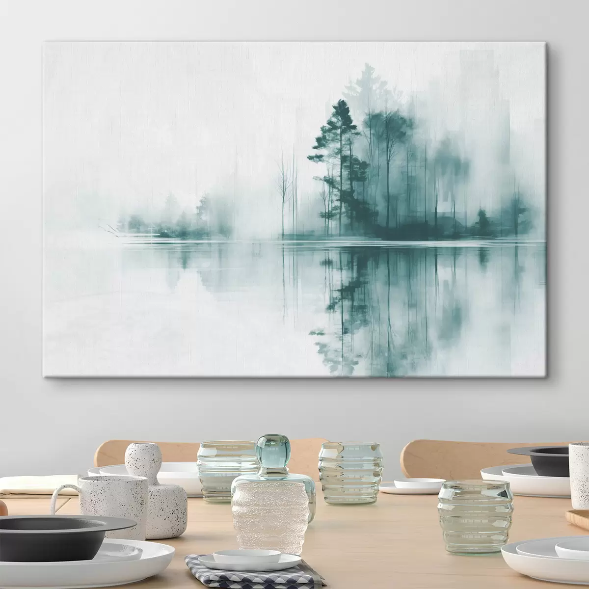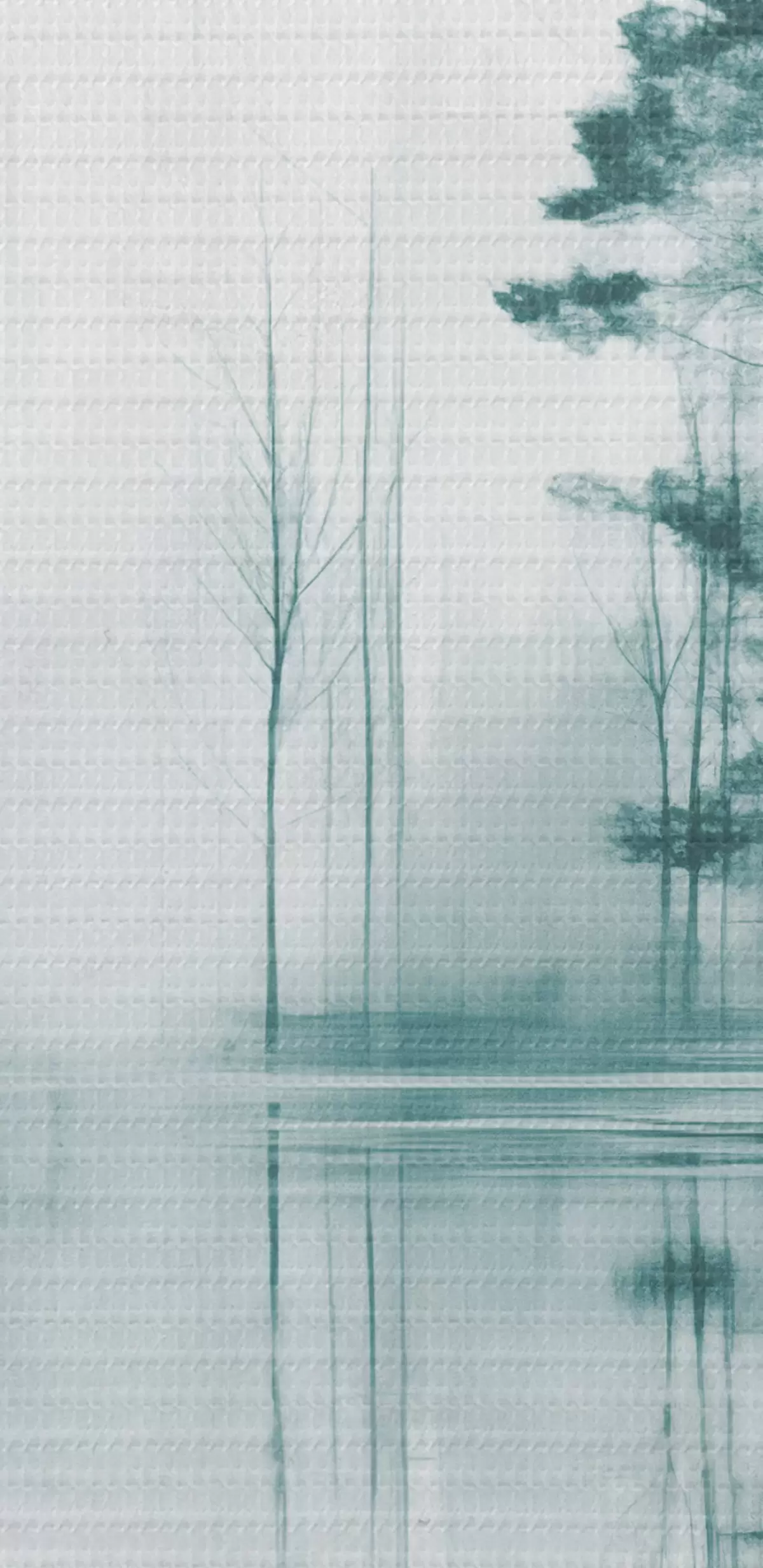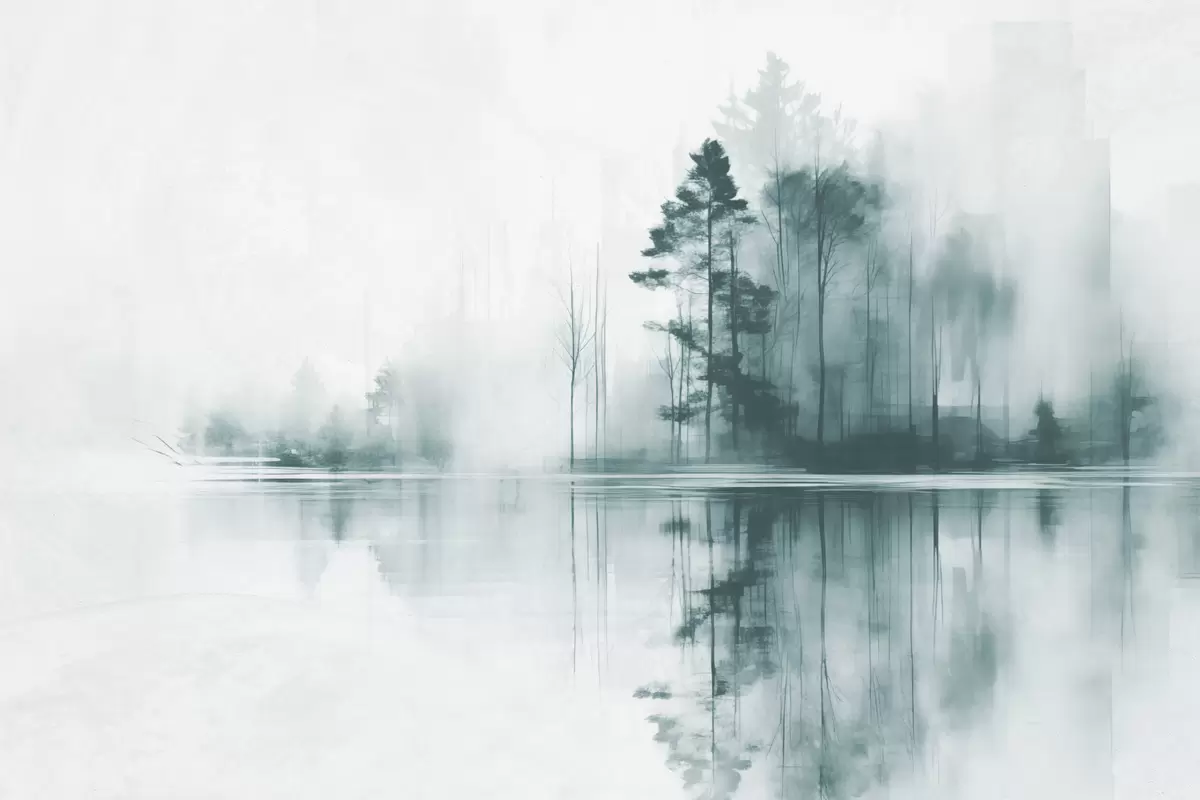 Wandbilder Abstrakter Wald mit hohen Bäumen, die sich im Wasser spiegeln, gedeckte Farbpalette Art. s44403
