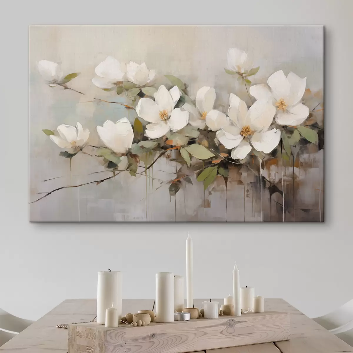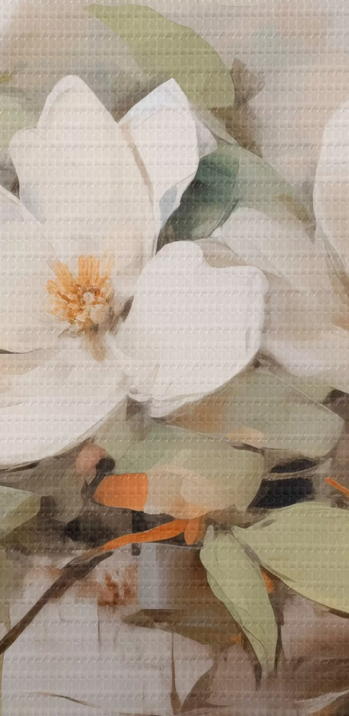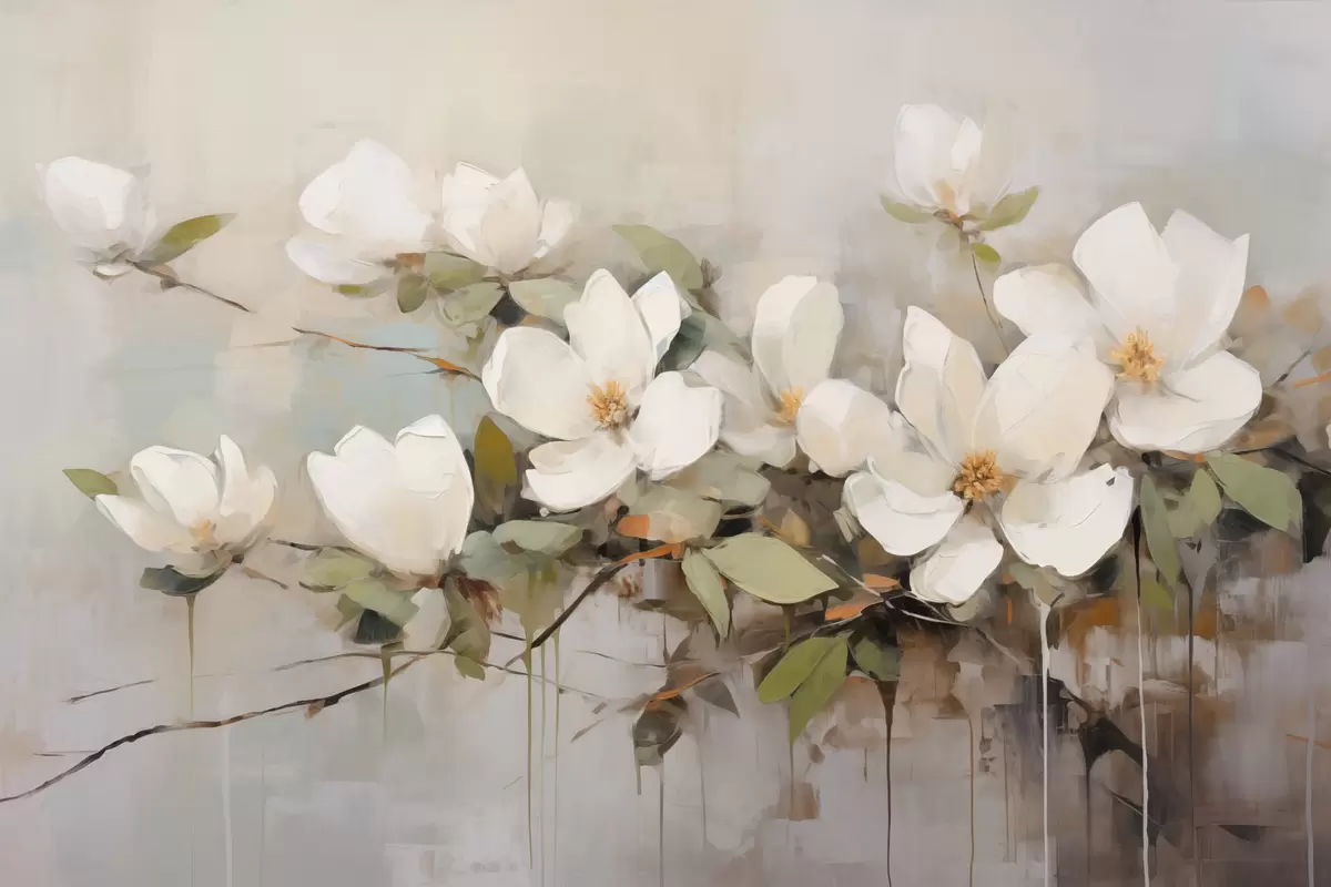 Wandbilder Weiße Magnolienblüten mit grünen Blättern auf einem Zweig, weiche Pinselstriche, gedeckte Farben Art. s44404