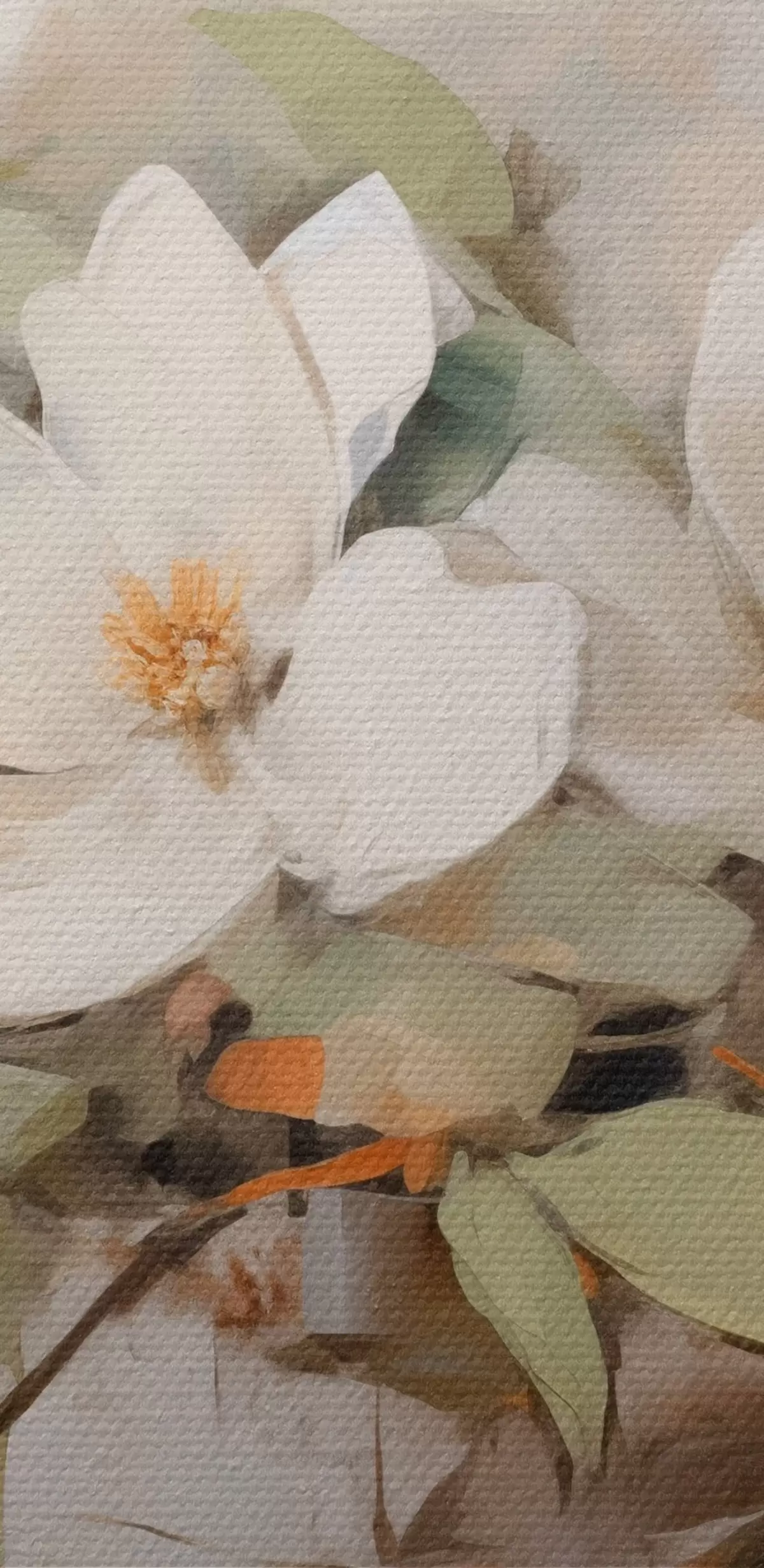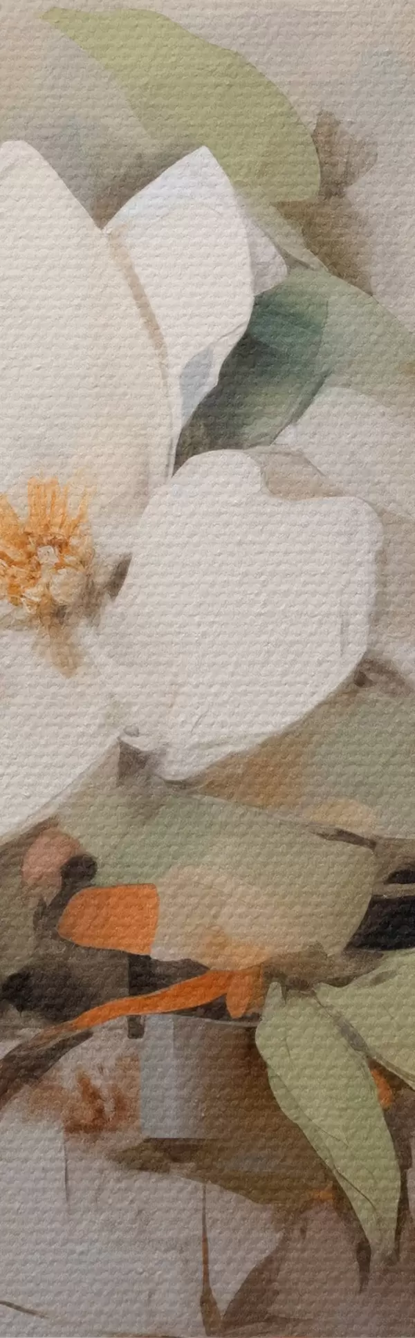 Wandbilder Weiße Magnolienblüten mit grünen Blättern auf einem Zweig, weiche Pinselstriche, gedeckte Farben s44404
