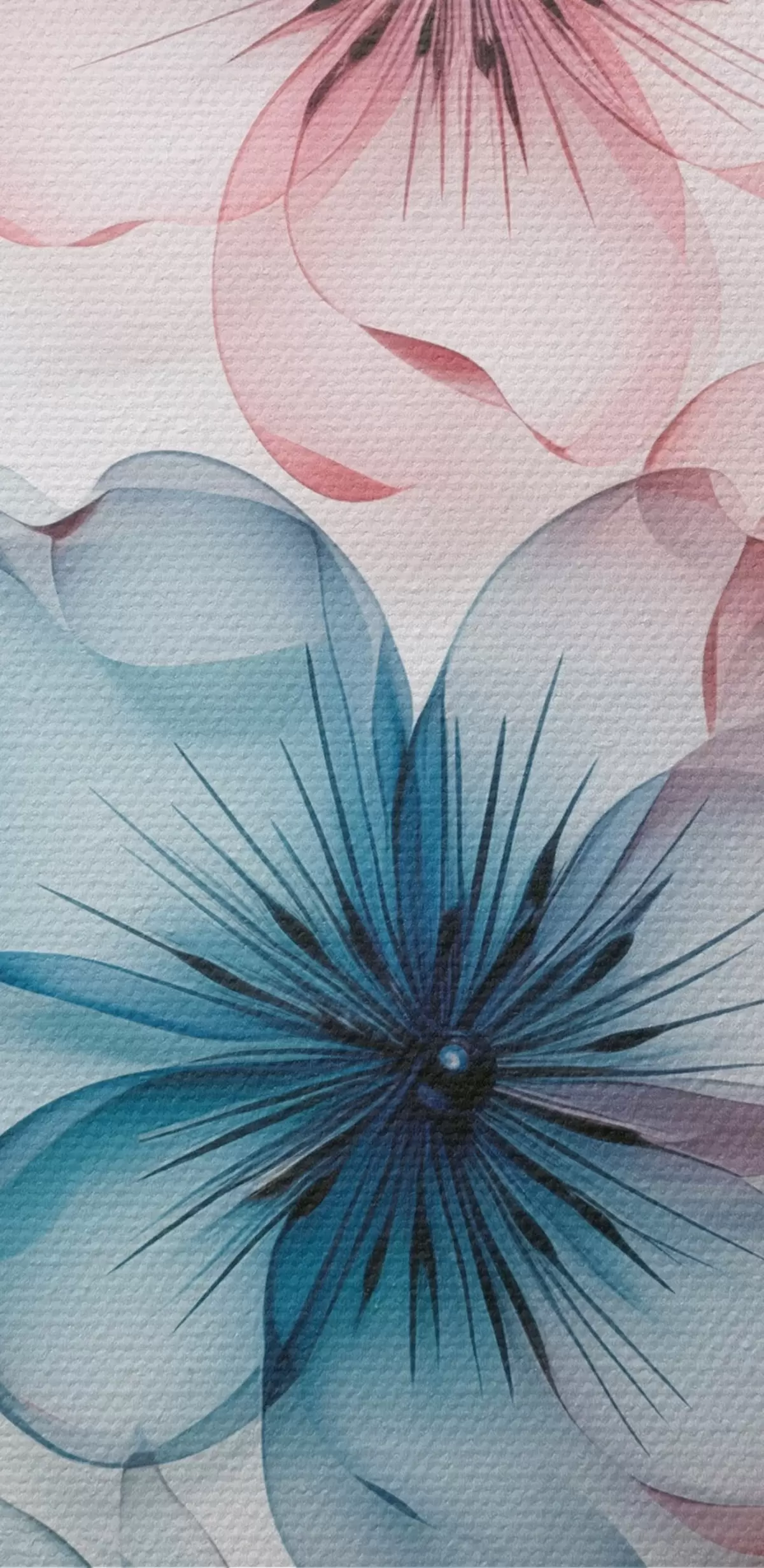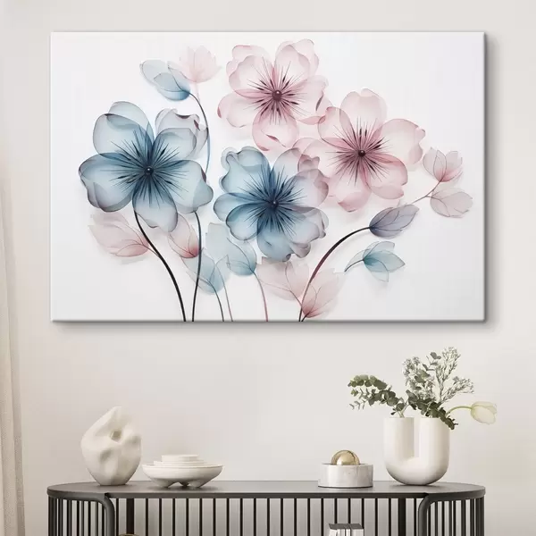 Wandbilder Transluzente, gedämpfte rosa und blaue Blüten mit sichtbaren Staubgefäßen und Stielen Art. s44405