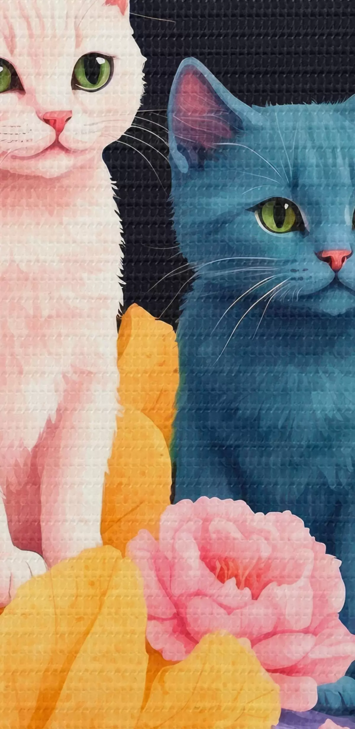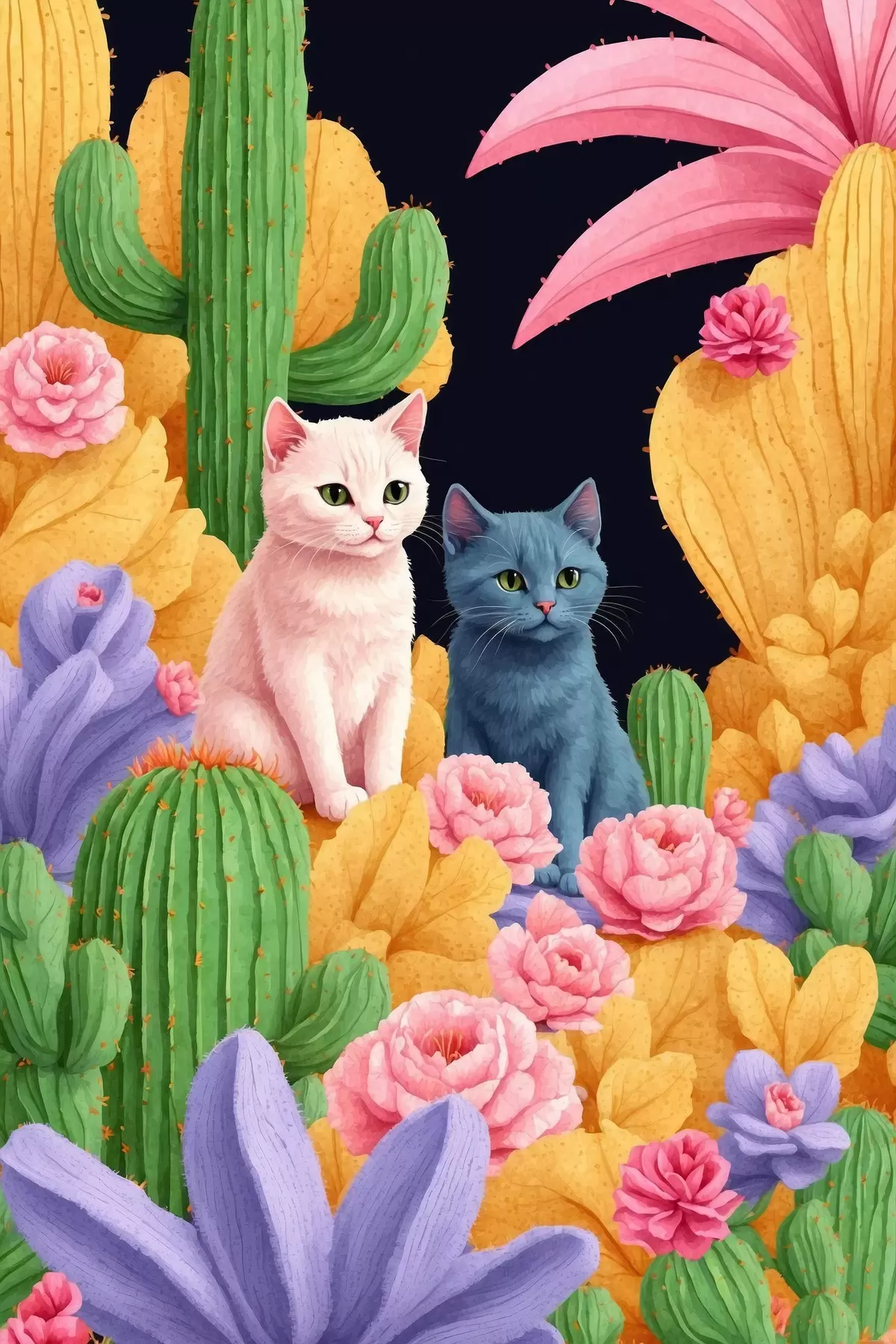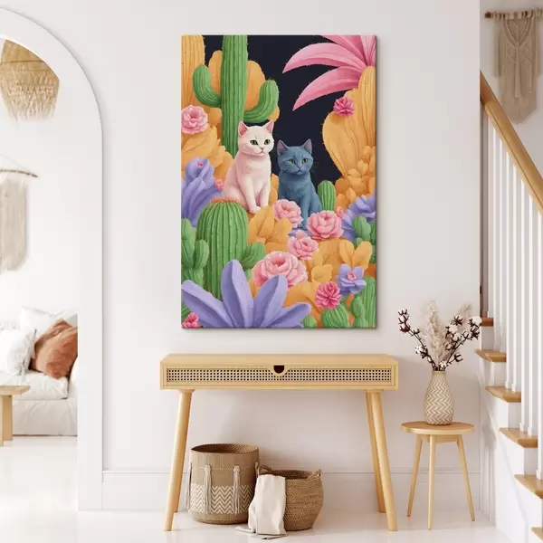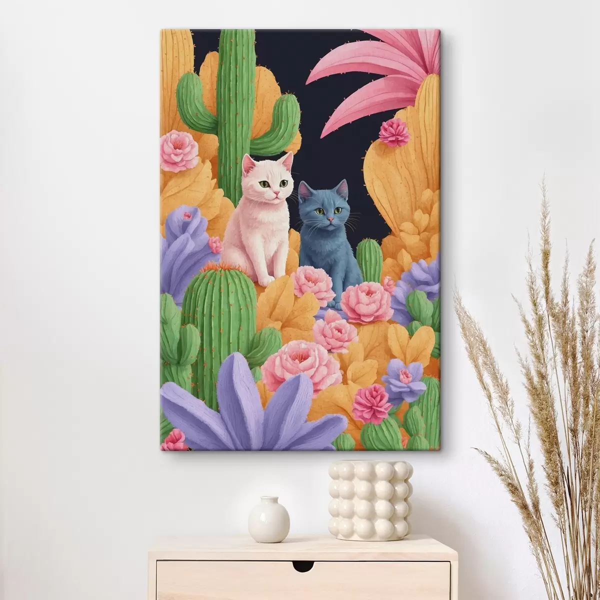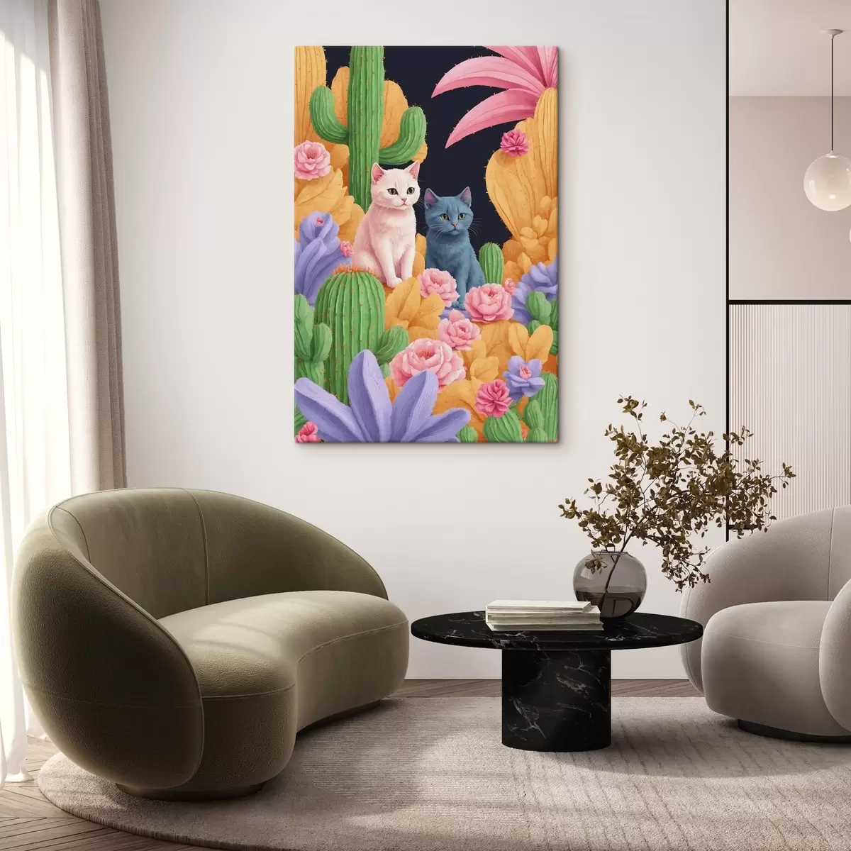 Wandbilder Künstliche Katzen zwischen Blumen und Kakteen Art. s44452