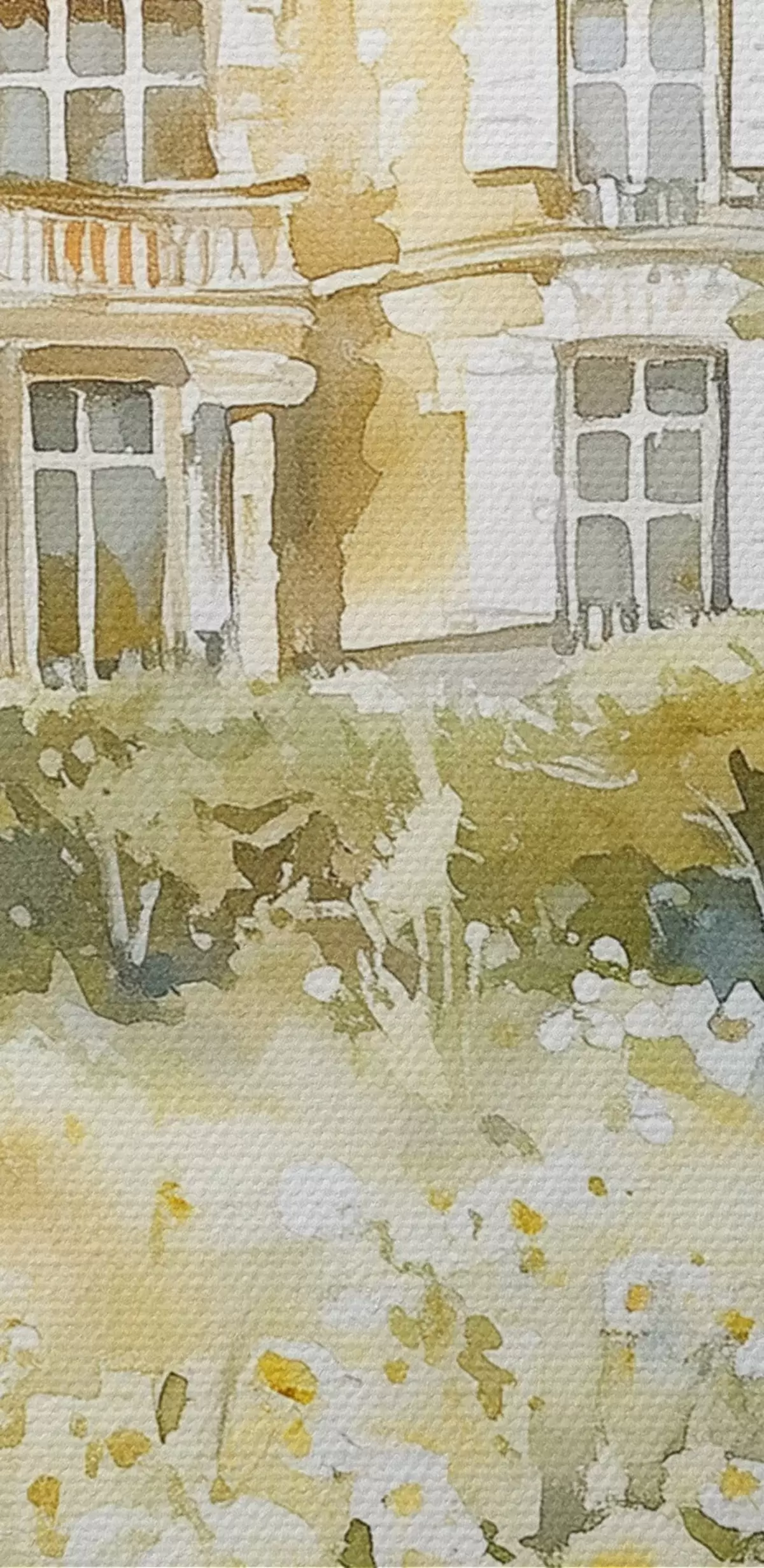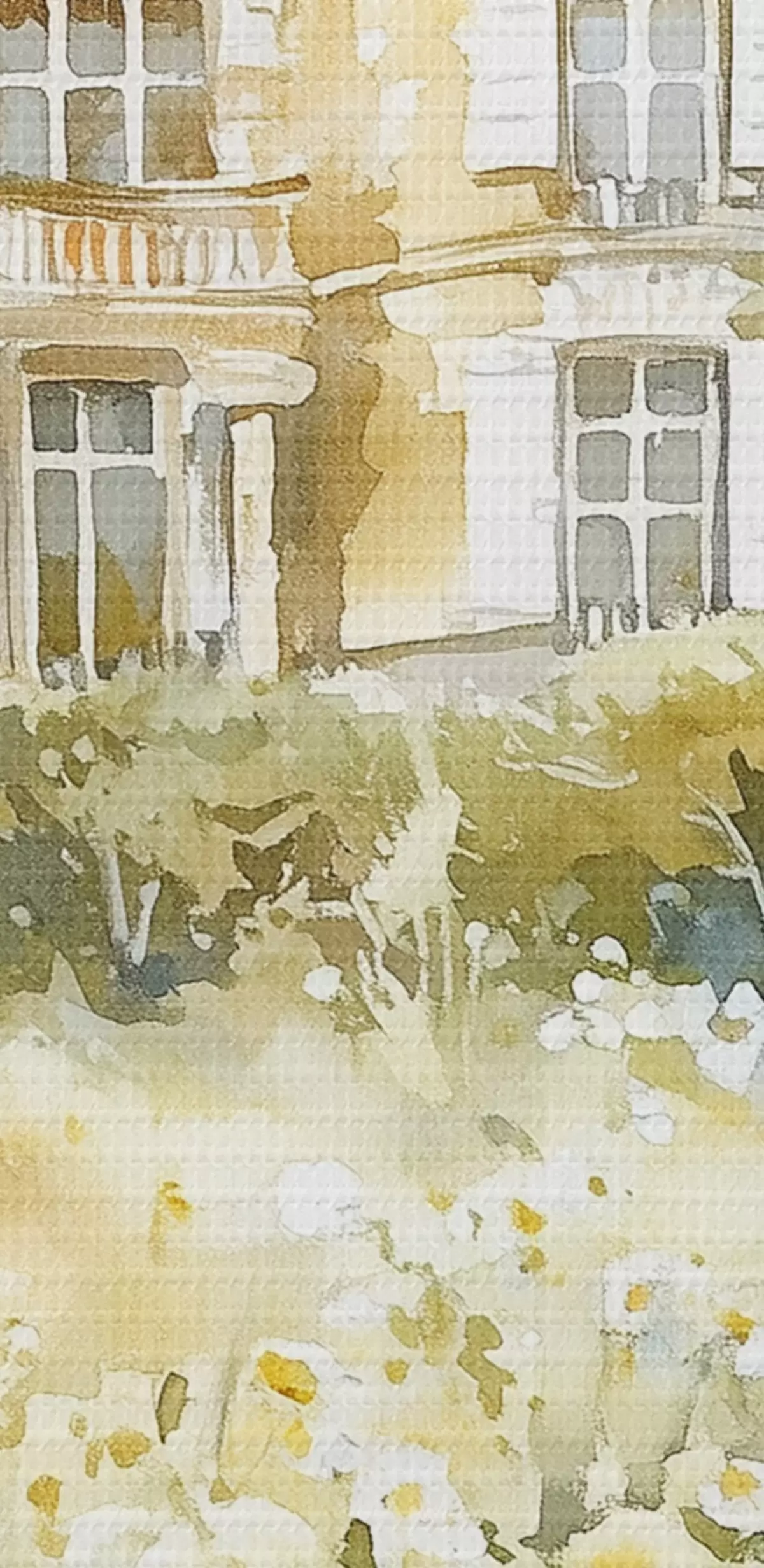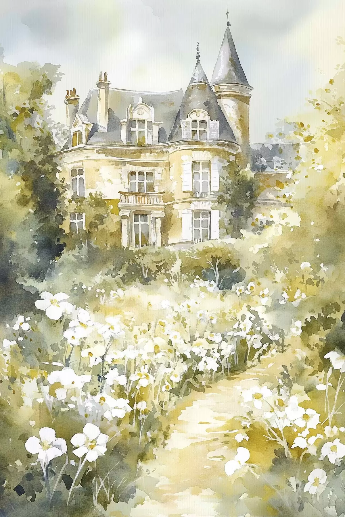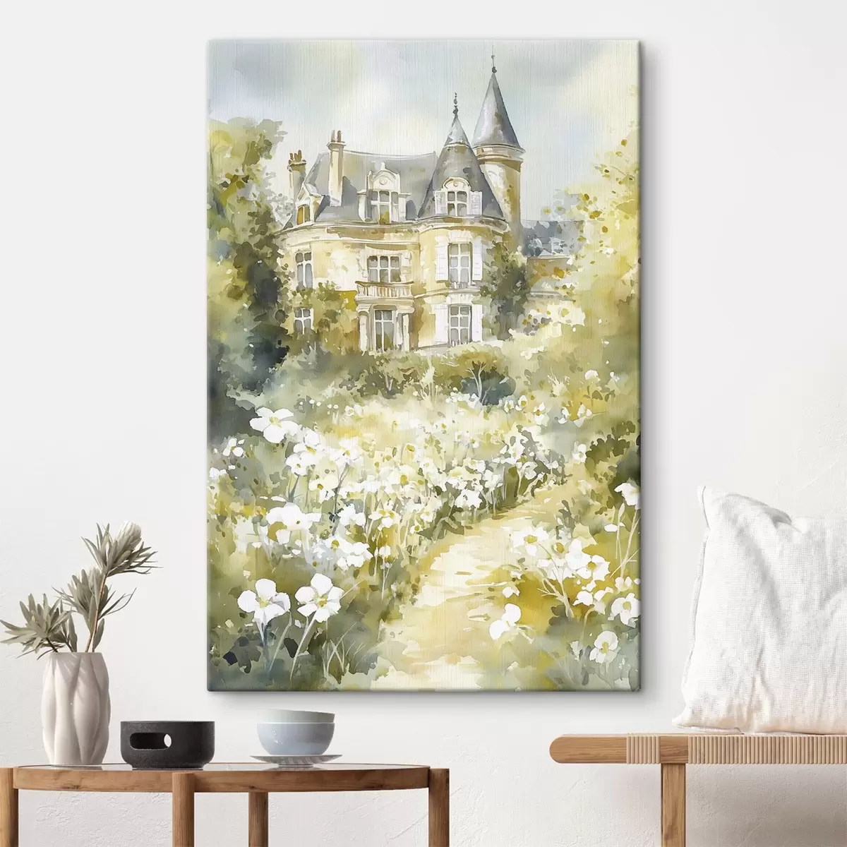 Wandbilder Schönes Schloss mit Grünzeug und weißen Blumen, Aquarell-Stil Art. s44506