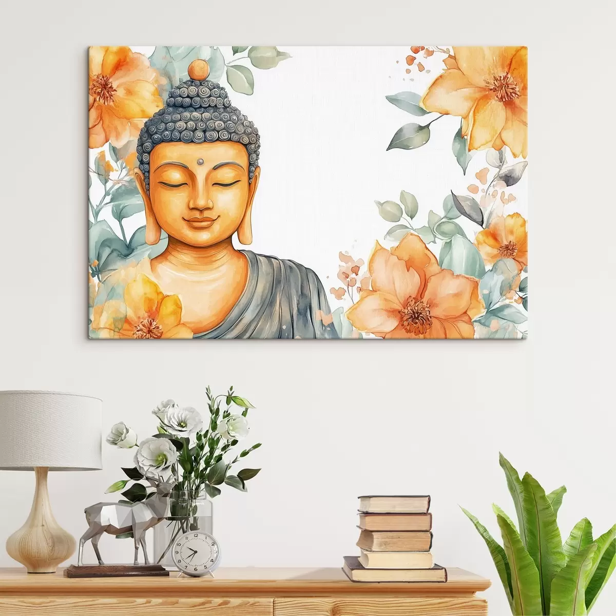 Wandbilder Buddha umgeben von orangefarbenen Blumen, Aquarellstil Art. s44508