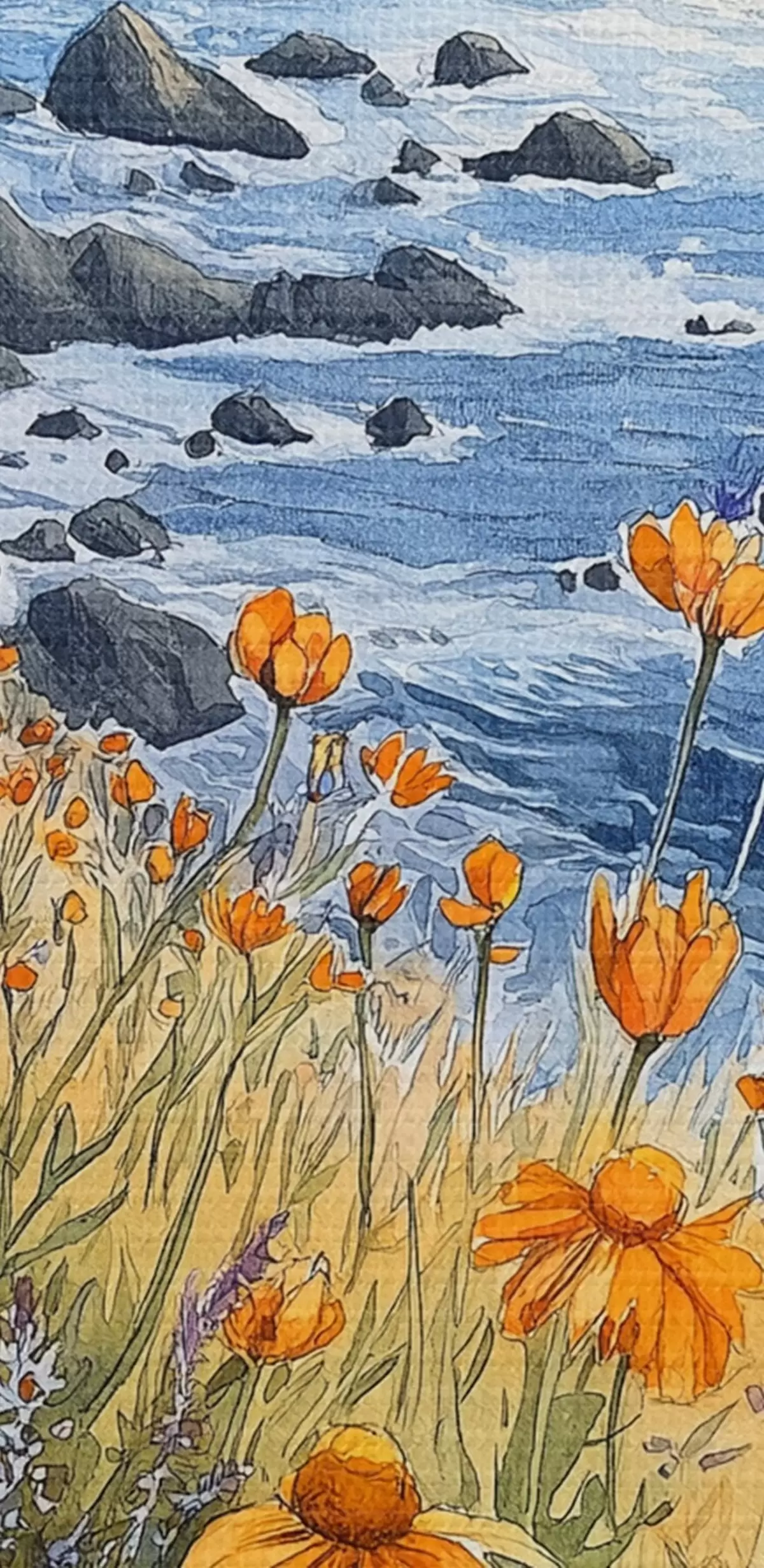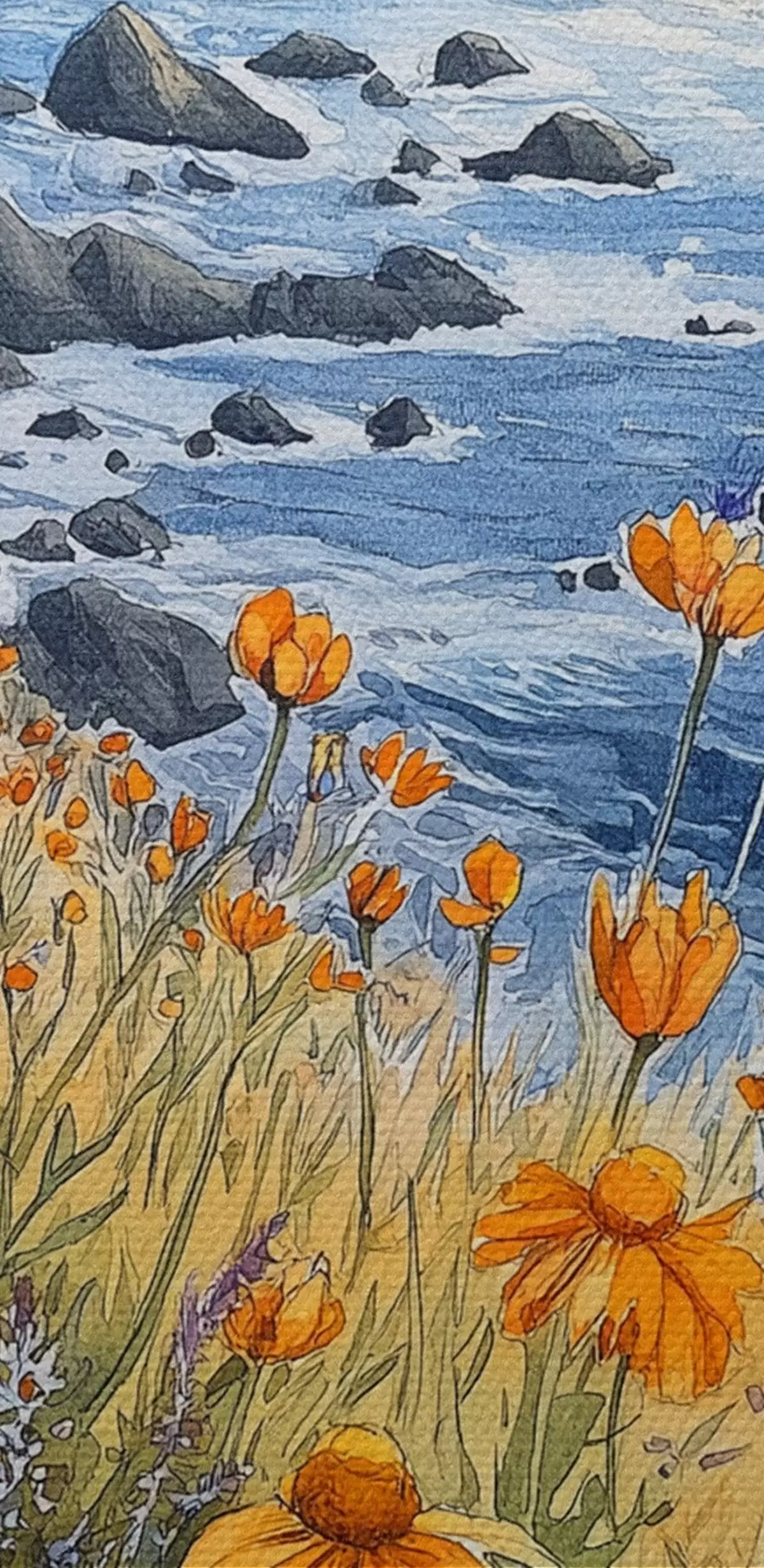Wandbilder Klippe mit orangefarbenen Blumen, Meeresküste, Portugal, Aquarellstil s44604