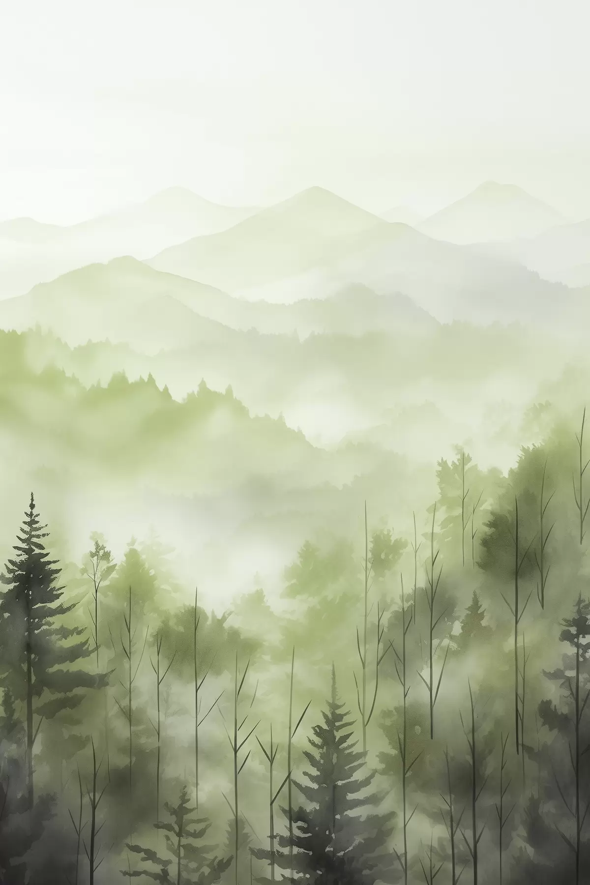 Wandbilder Berge mit Waldlandschaft, grüne Farben, Aquarellstil Art. s44606