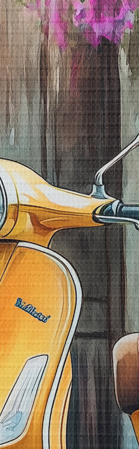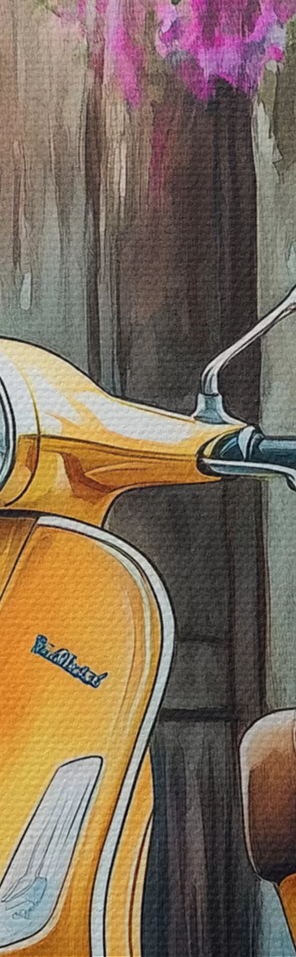 Wandbilder Gelber Vespa-Roller in der Nähe der Holztür mit Blumen Art. s44607