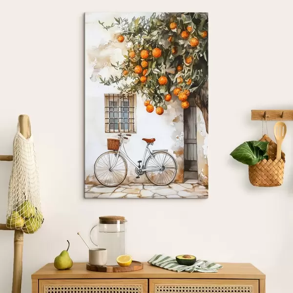 Wandbilder Weißes mediterranes Haus mit Orangenbaum und Fahrrad Art. s44610