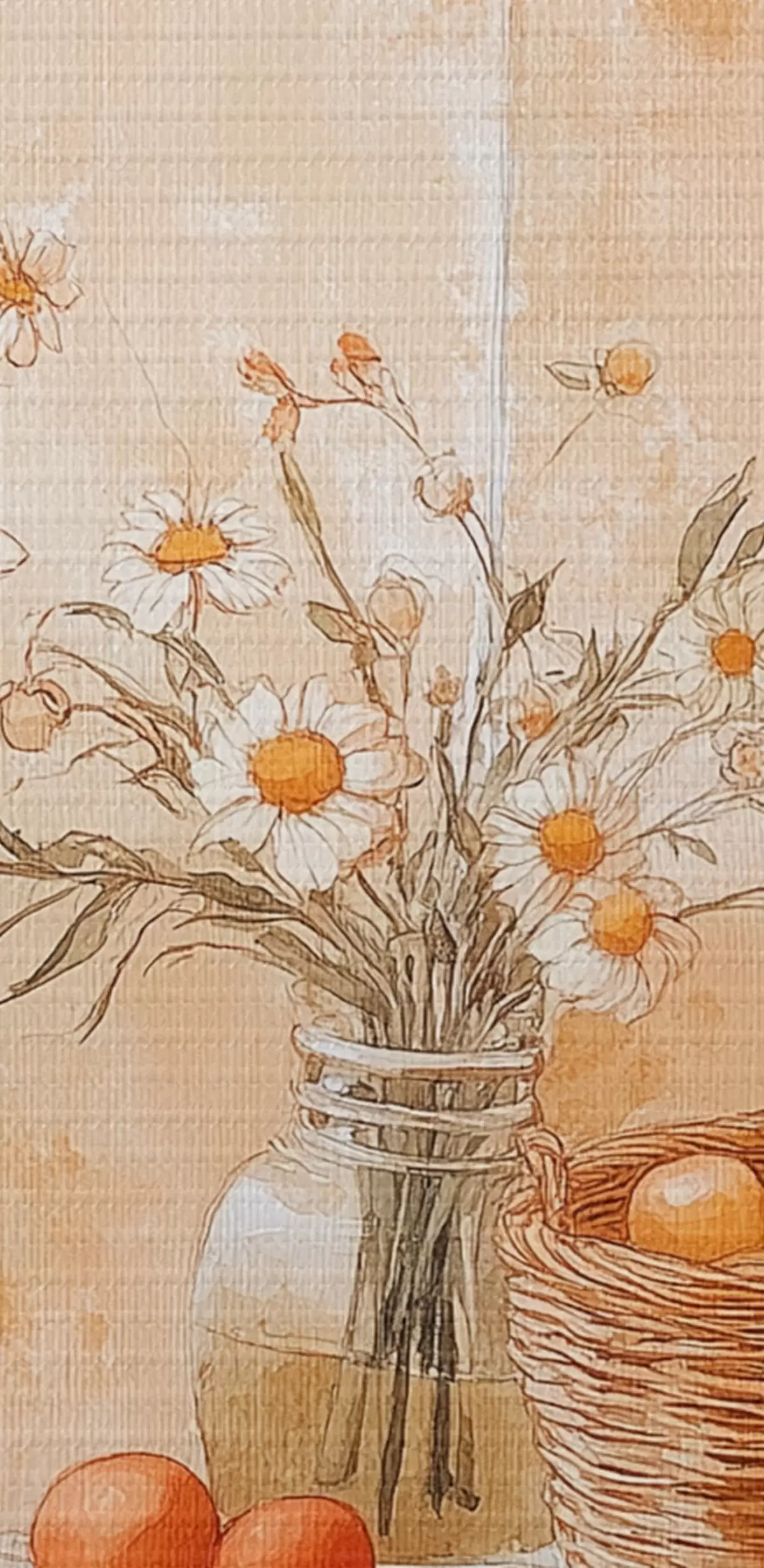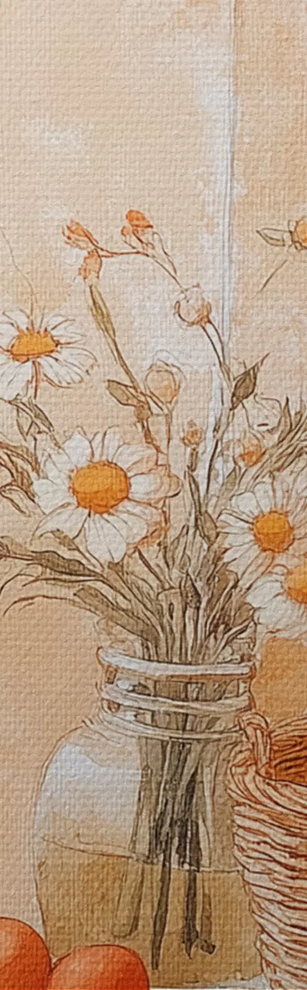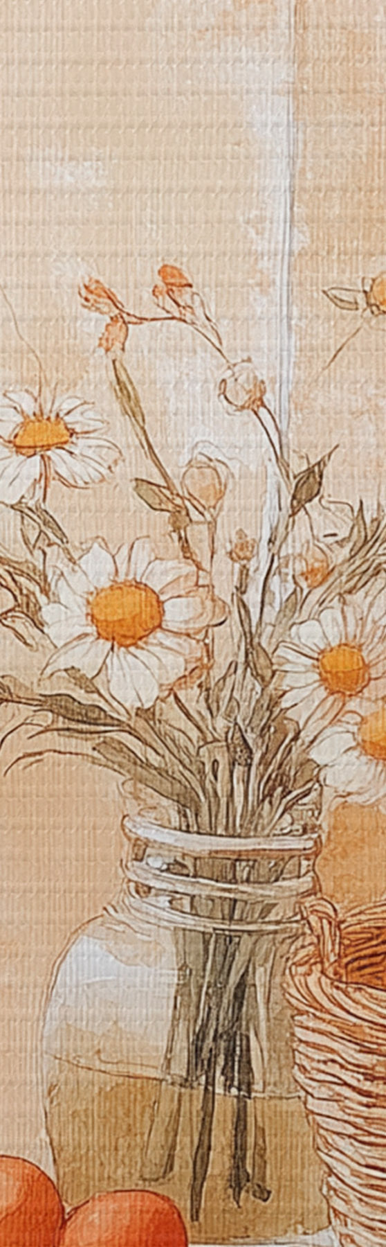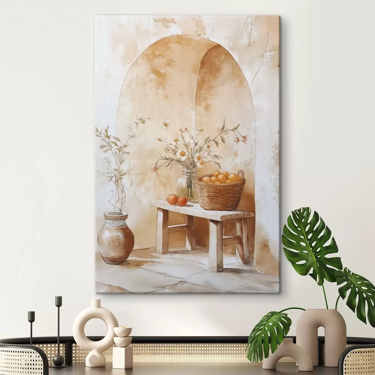 Wandbilder Bogenwand mit antikem Krug, Kamillenblüten und Korb mit Orangen Art. s44613