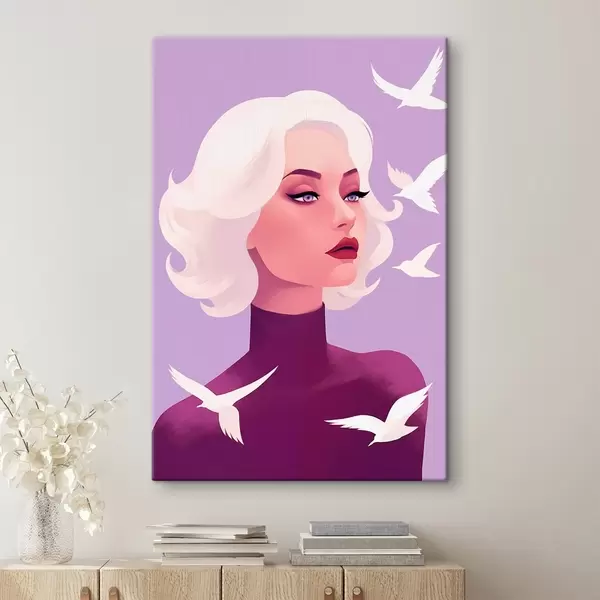 Wandbilder Weibliches Porträt mit weißen Haaren auf dem Hintergrund mit Vögeln Art. s44681