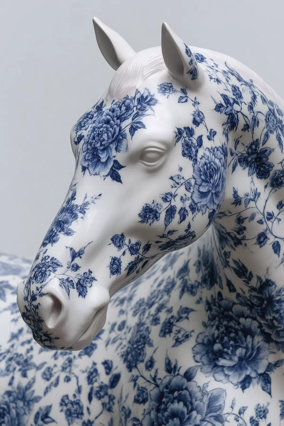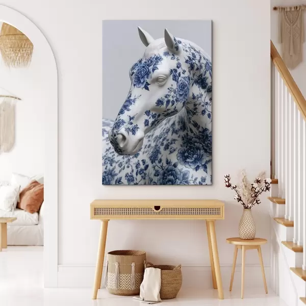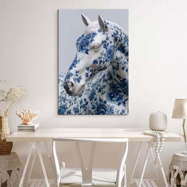 Wandbilder Porzellanpferd mit blauen Blumen bedruckt s44789