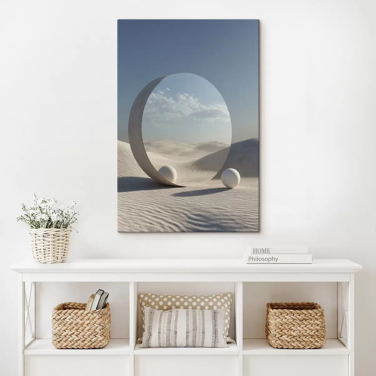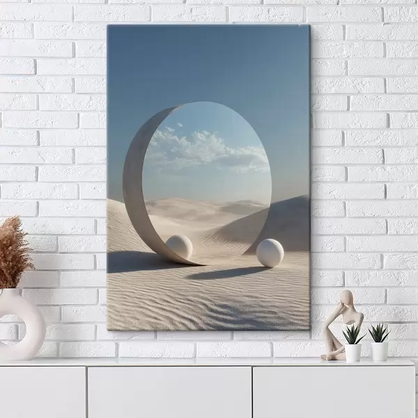 Wandbilder Surreale Wüstenlandschaft mit einem runden Spiegel, der den Himmel und den Mond reflektiert Art. s44792