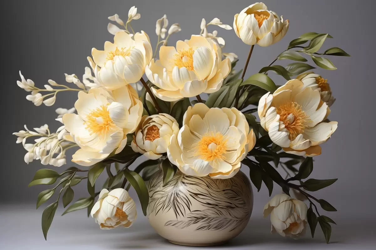 Wandbilder Zarte Blumen mit gelben Zentren in einer gemusterten Vase Art. s44847