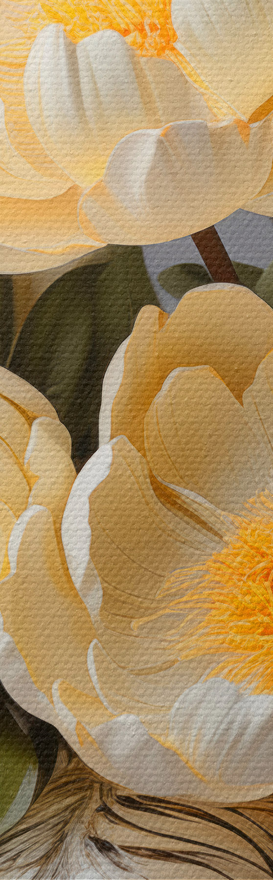 Drei Materialtypen stehen zur Verfügung: Economic Canvas - ein dichtes und haltbares Material für den Digitaldruck, identisch mit Malerleinwand, wasserfeste Oberfläche, realistische Wiedergabe von Details, mittelkörniges Material. Premium Canvas - die Textur ähnelt der einer Malerleinwand (verwobene kleine Fäden). Weiche, detaillierte Wiedergabe des Bildes auf einer matten Oberfläche. Eco-Premium - hochwertiges Gewebe aus 100% Baumwolle. Dank der natürlichen Baumwollfasern ist das Material langlebig und verschleißfest. Hervorragende Farbwiedergabe und Detailtreue.