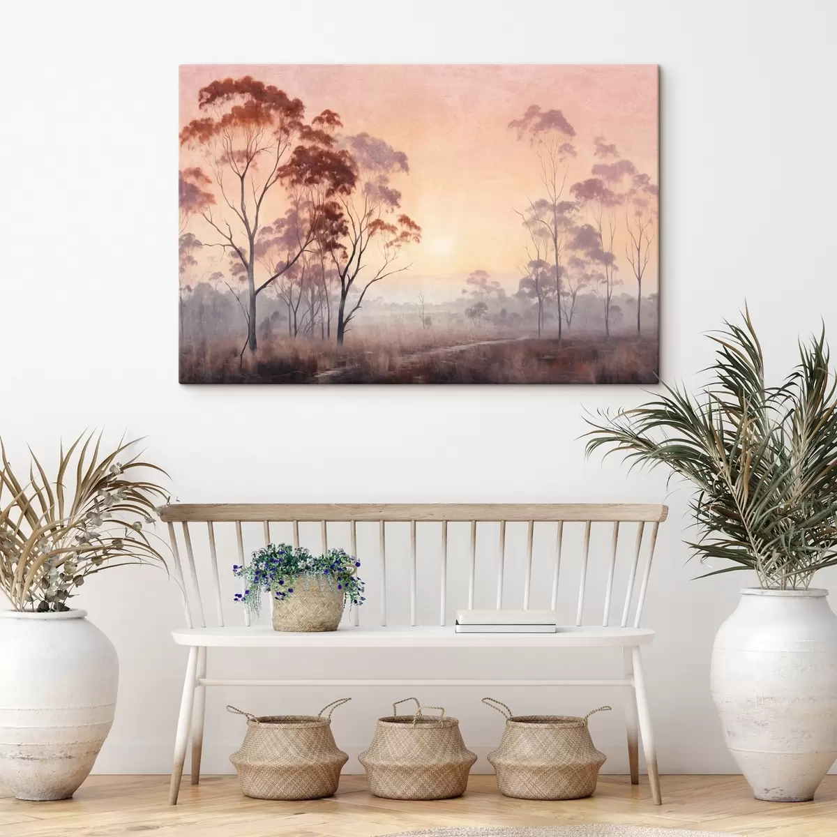 Wandbilder Ein Landschaftsgemälde eines Feldes mit hohem Gras und Bäumen, die Sonne ist im Hintergrund Art. s44854