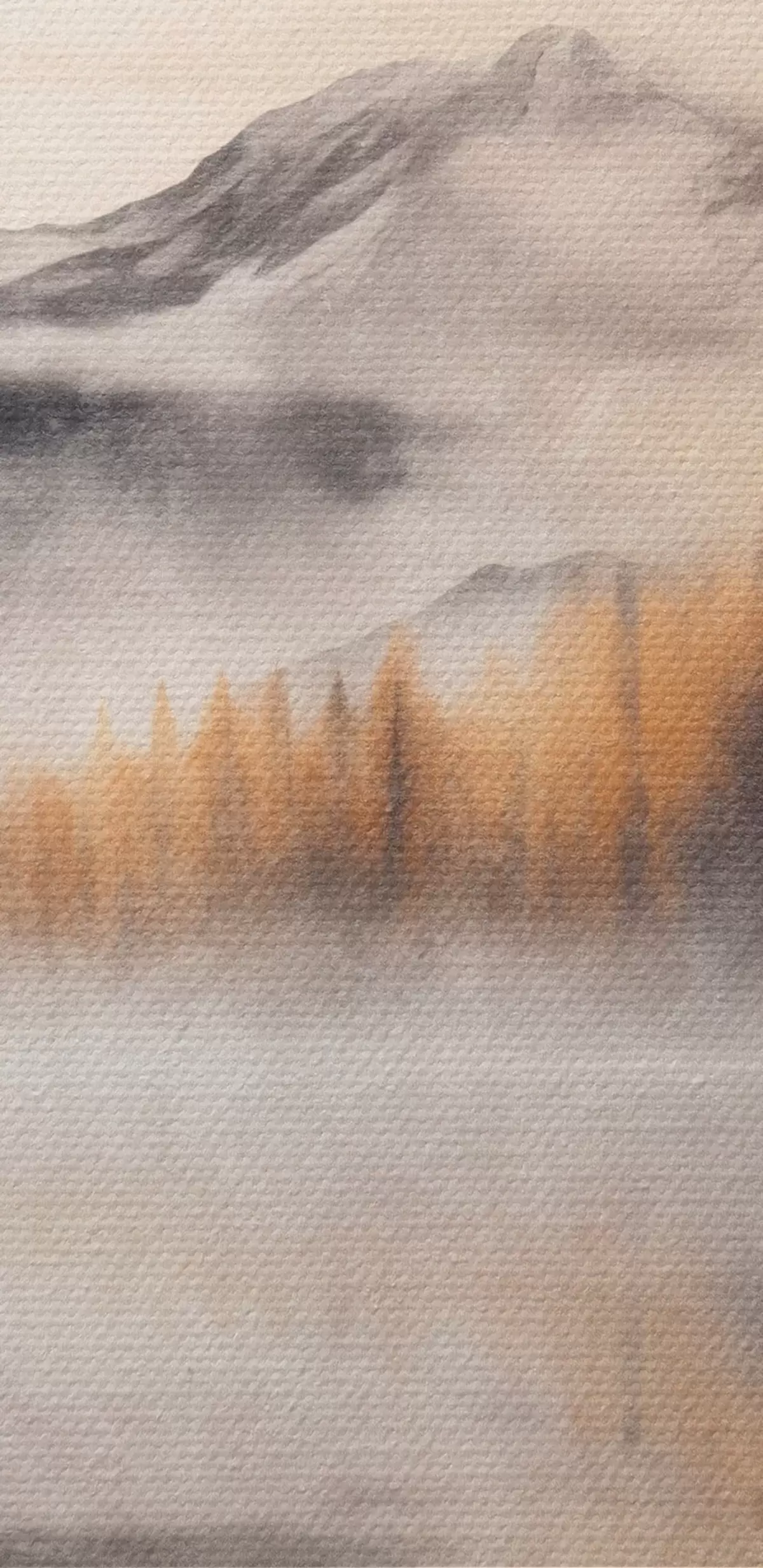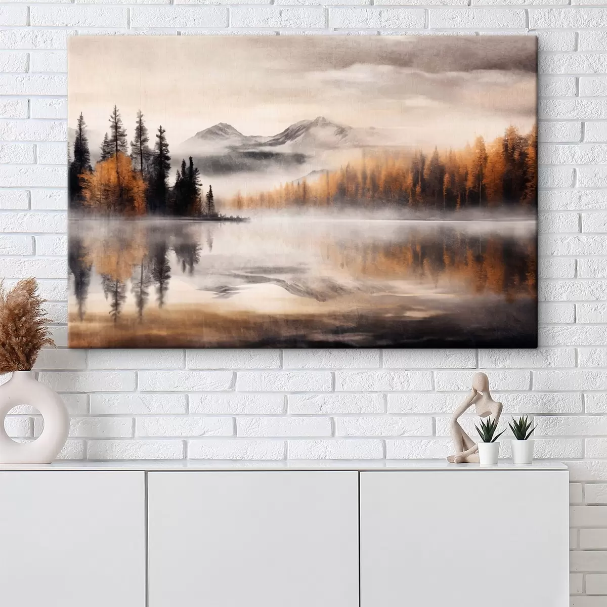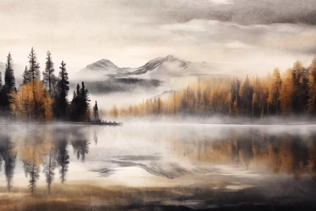 Wandbilder Eine neblige, strukturierte Seenlandschaft mit Kiefern und Bergen, wolkenverhangener grauer Himmel Art. s44856