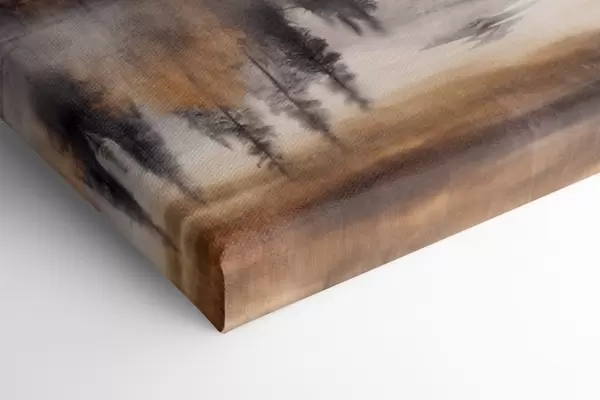 Wandbilder Eine neblige, strukturierte Seenlandschaft mit Kiefern und Bergen, wolkenverhangener grauer Himmel Art. s44856