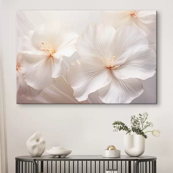 Wandbilder Zarte weiße Blumen mit Blütenblättern und zarten, pastellfarbenen Zentren, die eine verträumte und ätherische Blumenkunst schaffen Art. s44858