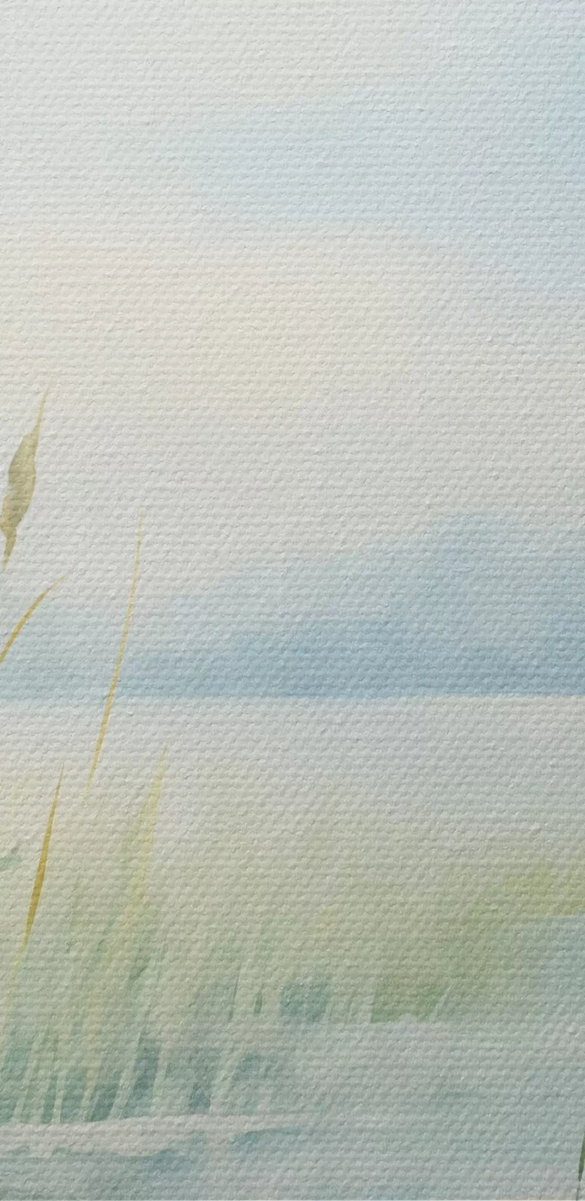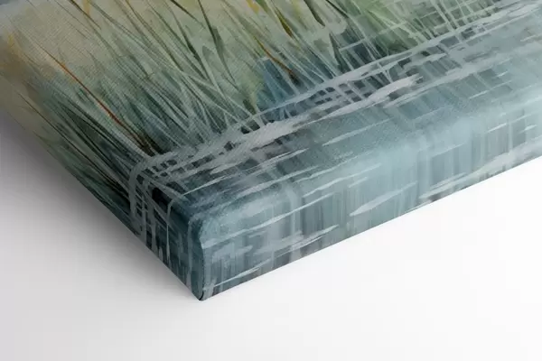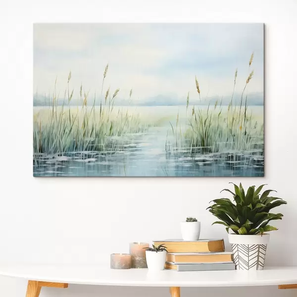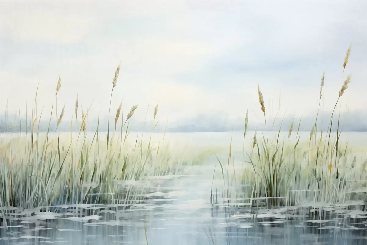 Wandbilder Ein Aquarell Malerei Nachahmung der hohen Gras wächst in der Nähe von Wasser, bedecktem Himmel und unscharfen Hintergrund Art. s44860