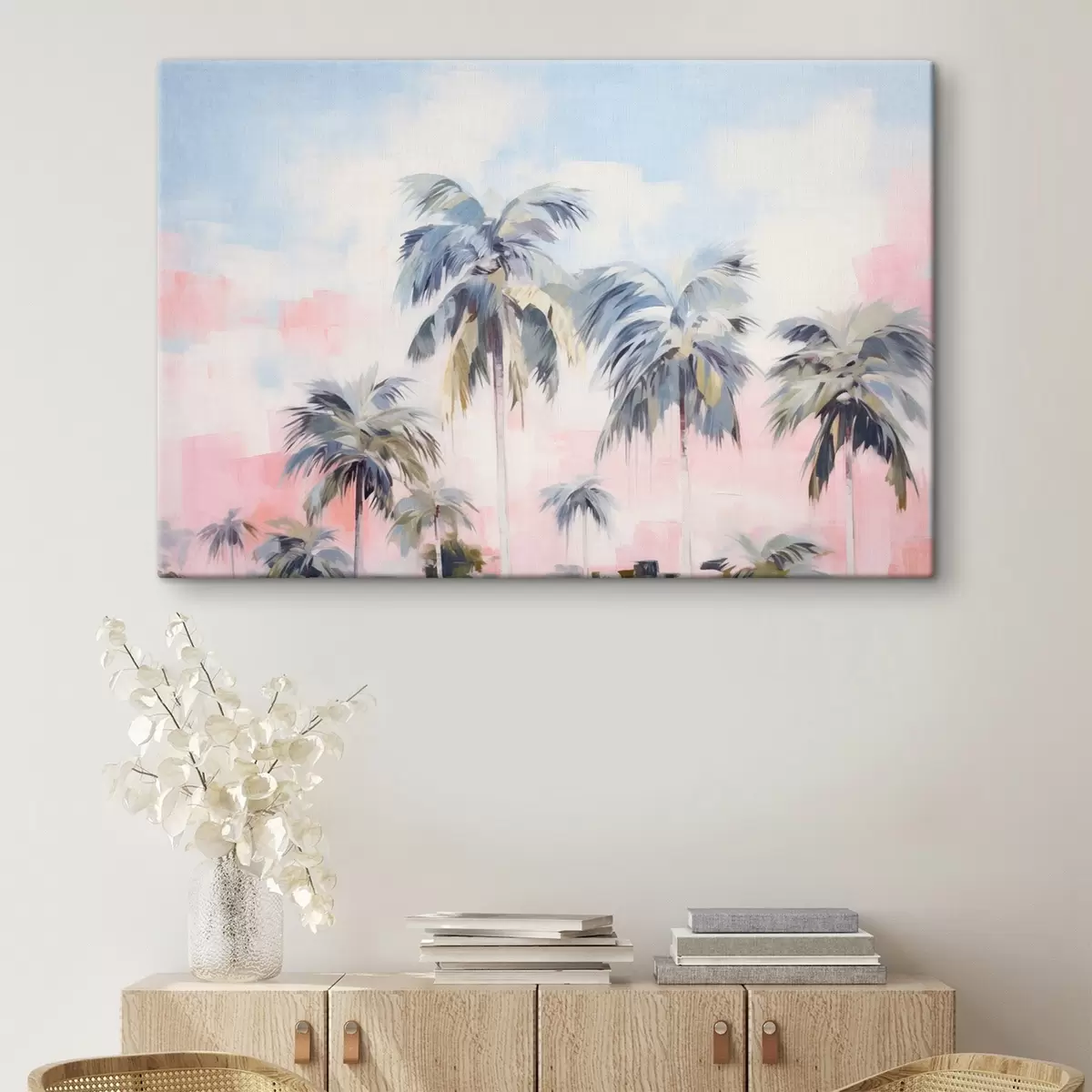 Wandbilder Palmen mit pastellfarbenen Blättern und braunen Stämmen, rosa und blauer Himmel, tropische Umgebung Art. s44866
