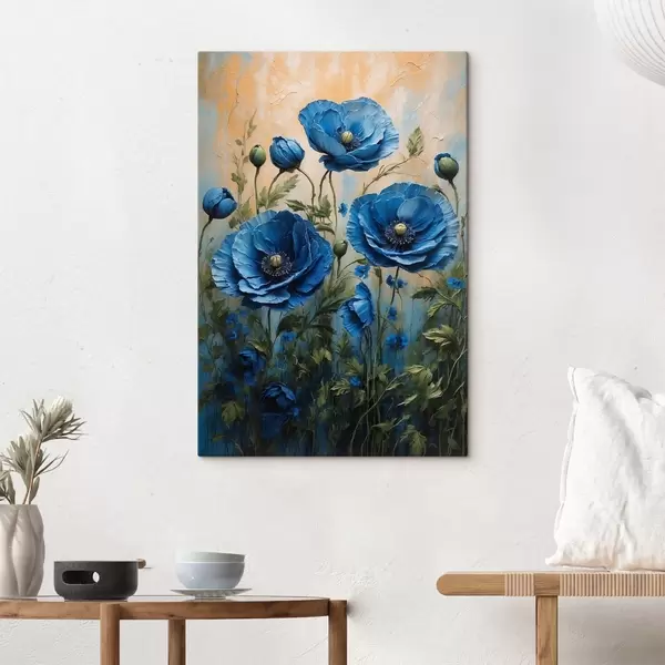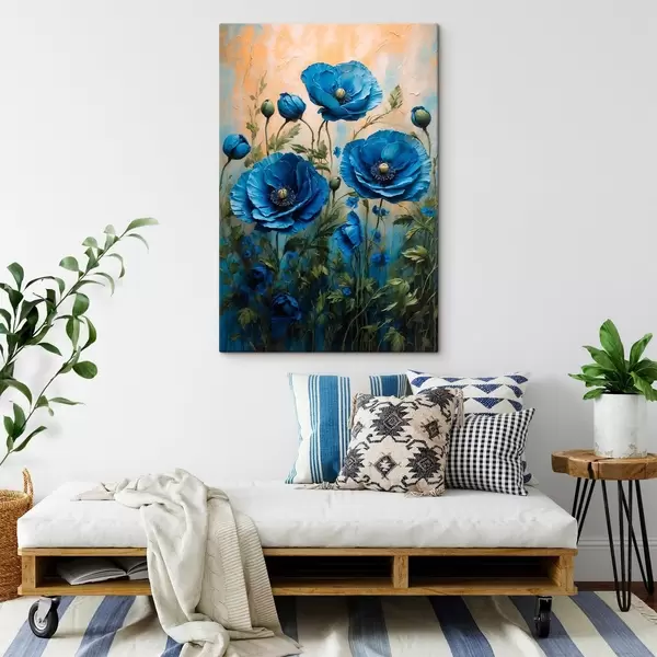 Wandbilder Blaue Mohnblumen auf einem pastellfarbenen Hintergrund mit Blättern Art. s44882