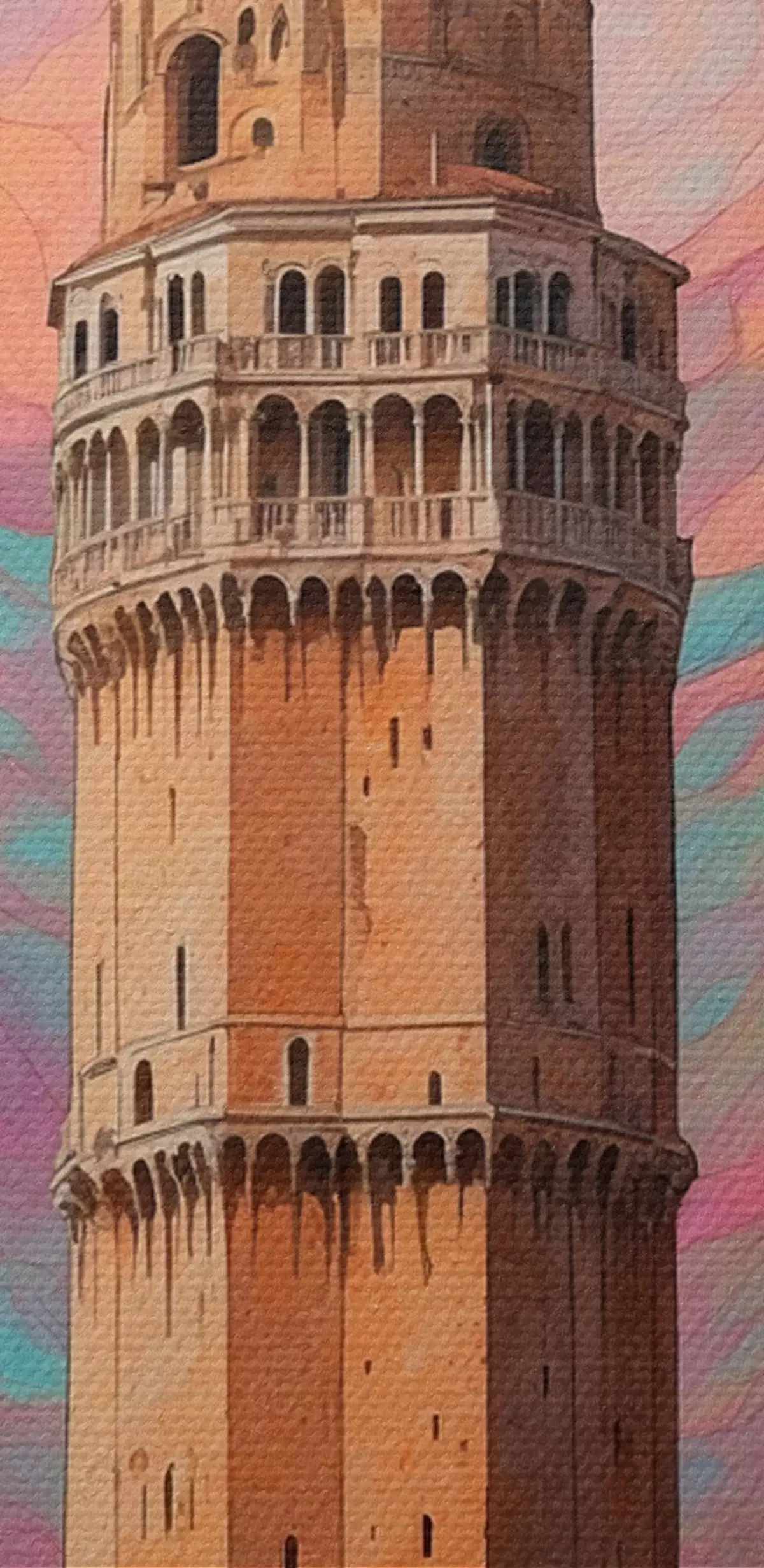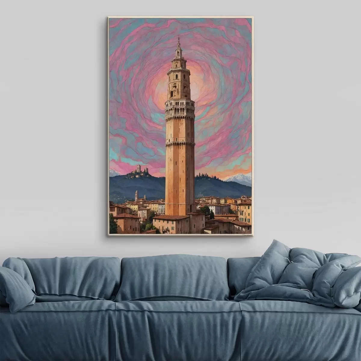 Wandbilder Fantasieturm gegen den Himmel mit rosa und blauen Spiralen Art. s44885