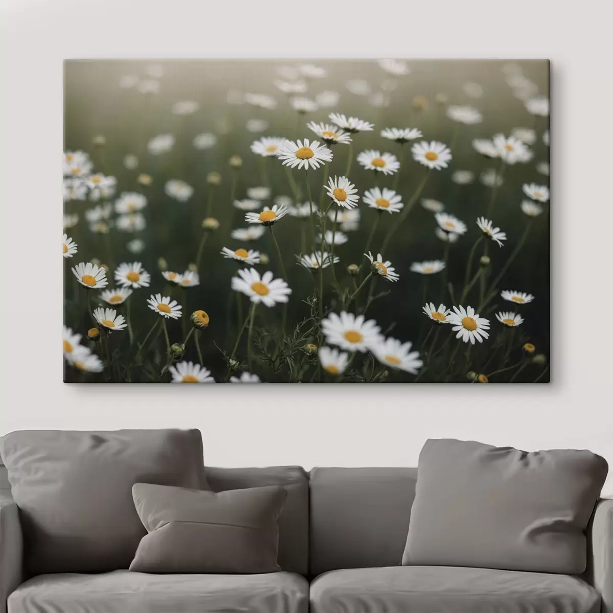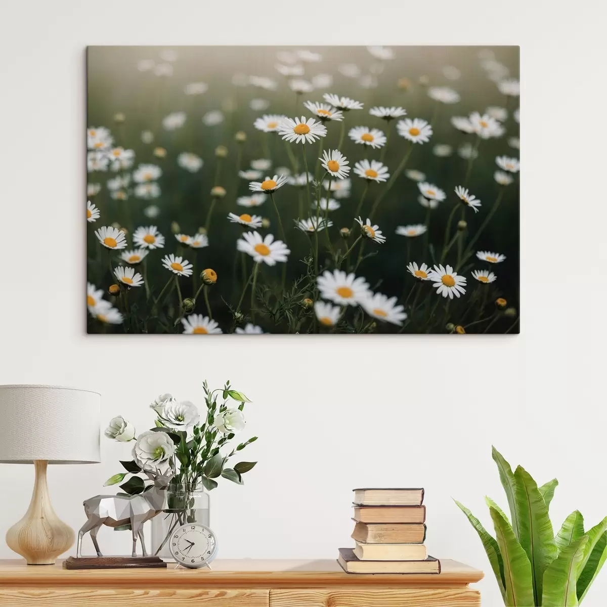 Wandbilder Gänseblümchenfeld mit unscharfem grünen Hintergrund s44898