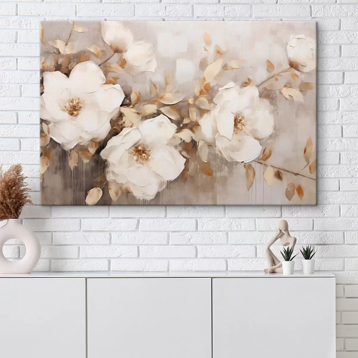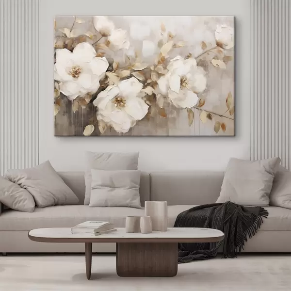 Wandbilder Weiße Blumen mit braunen Blättern in einem beigen Hintergrund, Ölgemälde Nachahmung, Blumenarrangement, botanische Kunst Art. s44922