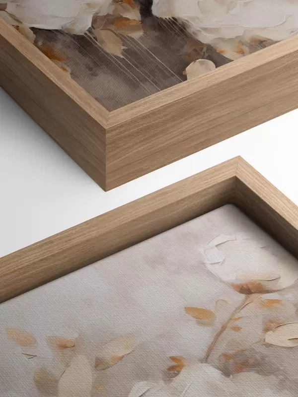 Wandbilder Weiße Blumen mit braunen Blättern in einem beigen Hintergrund, Ölgemälde Nachahmung, Blumenarrangement, botanische Kunst s44922