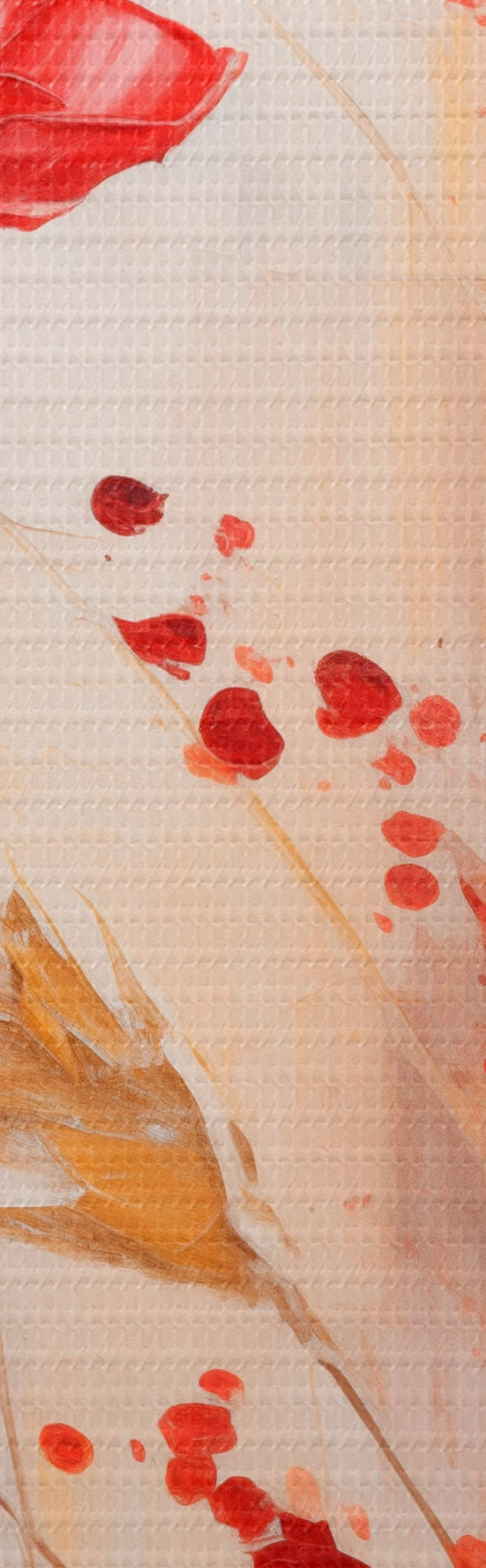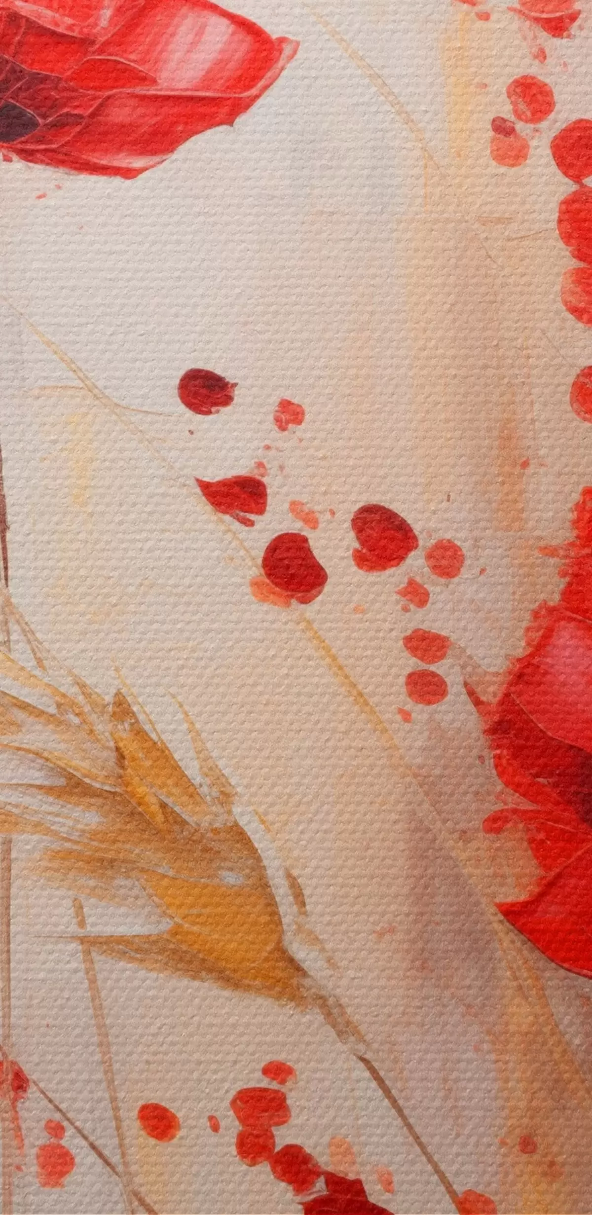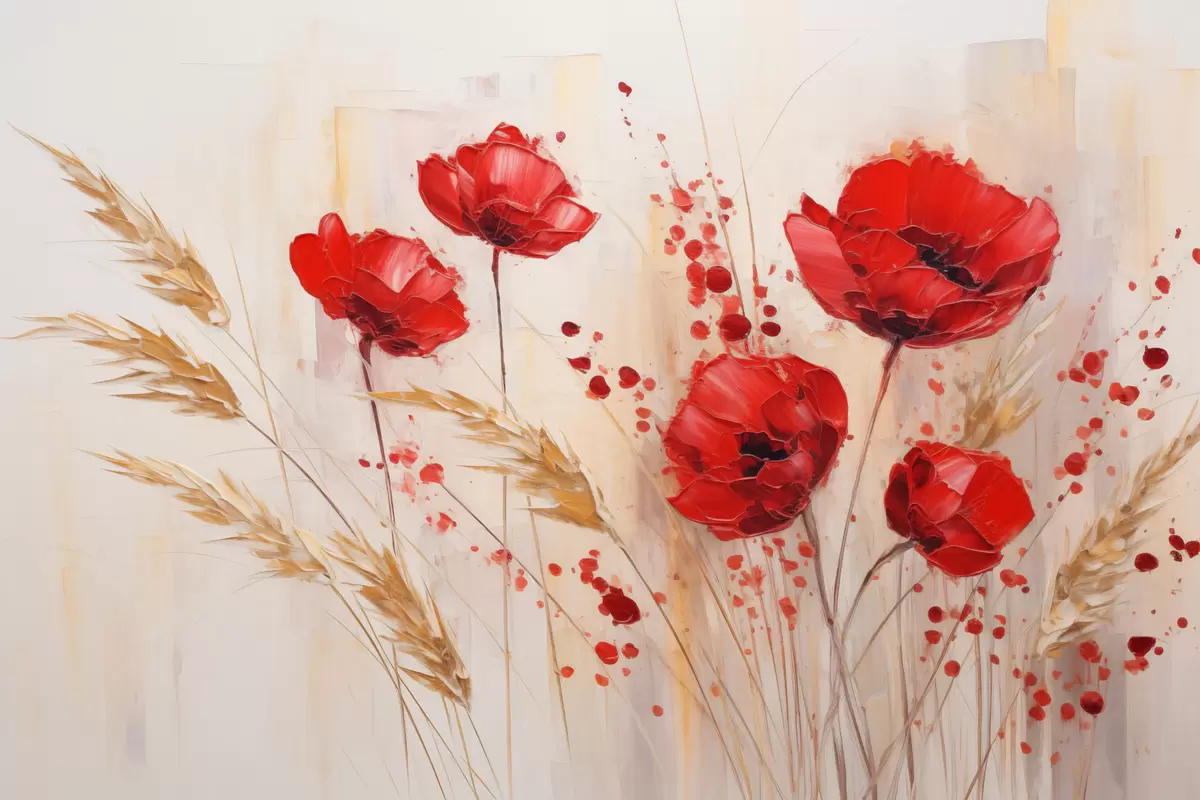Wandbilder Rote Mohnblumen mit gelben Weizenhalmen, vor einem weichen, neutralen Hintergrund mit roten Farbspritzern s44926