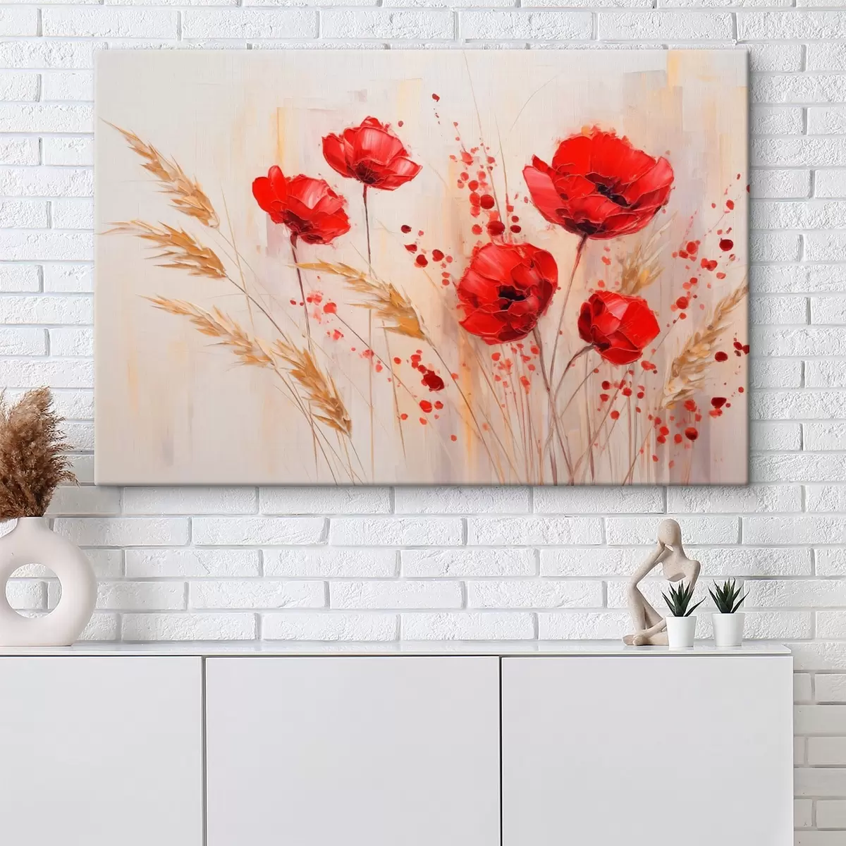 Wandbilder Rote Mohnblumen mit gelben Weizenhalmen, vor einem weichen, neutralen Hintergrund mit roten Farbspritzern Art. s44926
